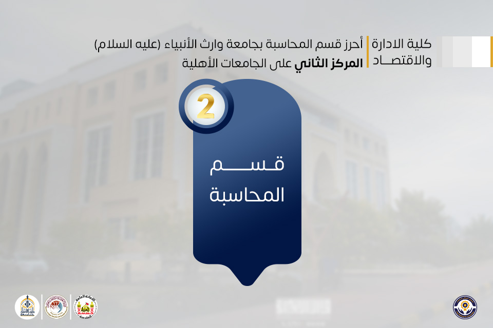 كما حقق قسم المحاسبة في كلية الإدارة والاقتصاد المركز الثاني على مستوى الجامعات الأهلية، والمرتبة الثامنة حكوميًا، بما يعكس كفاءة المخرجات التعليمية ودورها في دعم الاقتصاد وبناء مؤسسات مالية فاعلة، بما ينسجم مع الهدف الثامن (العمل اللائق والنمو الاقتصادي) والهدف التاسع (الصناعة والابتكار والبنى التحتية).