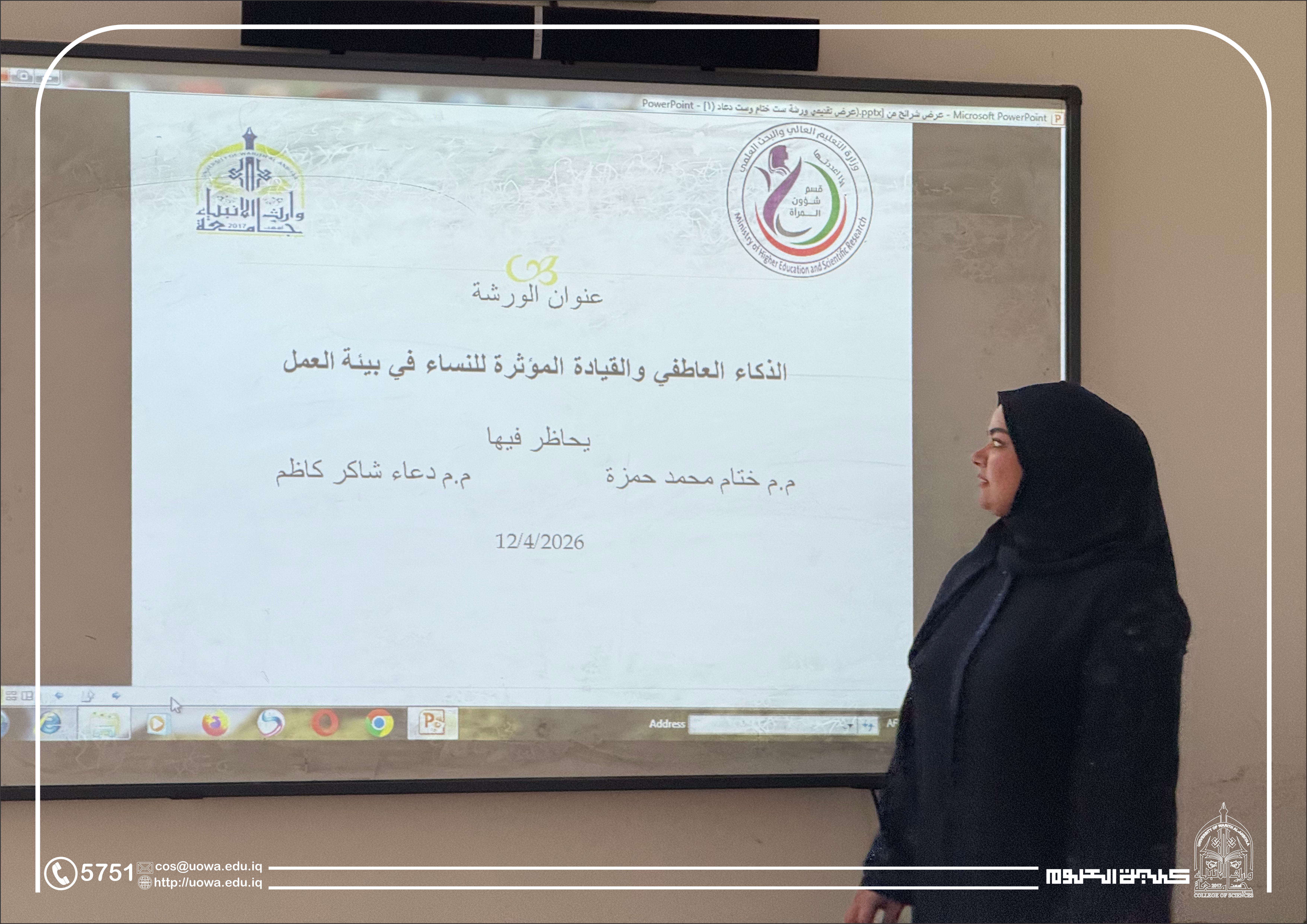نُظِّمت ورشة تدريبية بعنوان “الذكاء العاطفي والقيادة المؤثرة للنساء في بيئة العمل”، قدّمتها المدرس المساعد ختام محمد حمزة والمدرس المساعد دعاء شاكر كاظم، بهدف تنمية المهارات القيادية وتعزيز كفاءة المرأة في بيئات العمل الحديثة.
