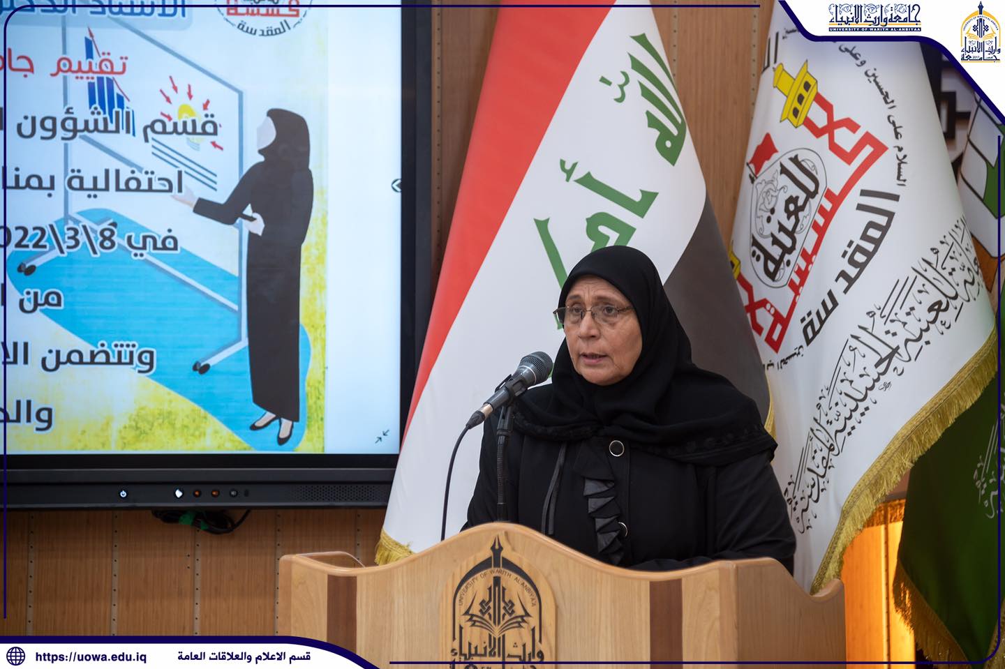 إذ تضمن المهرجان فعاليات تكريم للموظفات المثابرات في الجامعة ،وكلمة لممثلة وحدة تمكين المرأة الدكتورة نضال المالكي أكدت فيها على أهمية تفعيل دور المرأة في المجتمع وتمكينها وتعزيز مشاركتها، فضلاً عن دورها في الحفاظ على أسرتها لأنها نواة المجتمع.