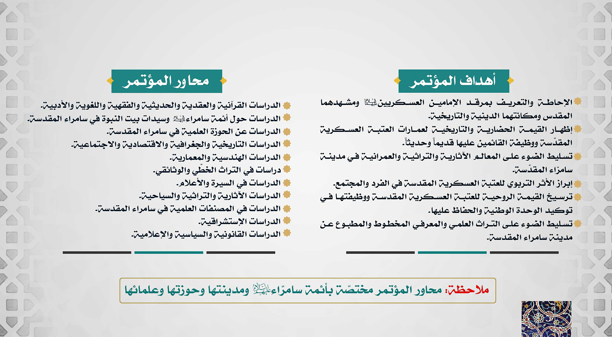 تحت شعار (العتبة العسكرية المقدسة في سامراء حاضرة الفكر والتراث) وبرعاية العتبة العسكرية المقدسة، يقيم مركز تراث سامراء (المؤتمر العلمي الدولي الثالث)