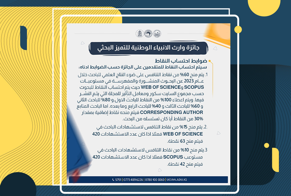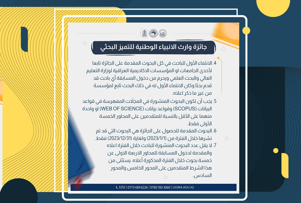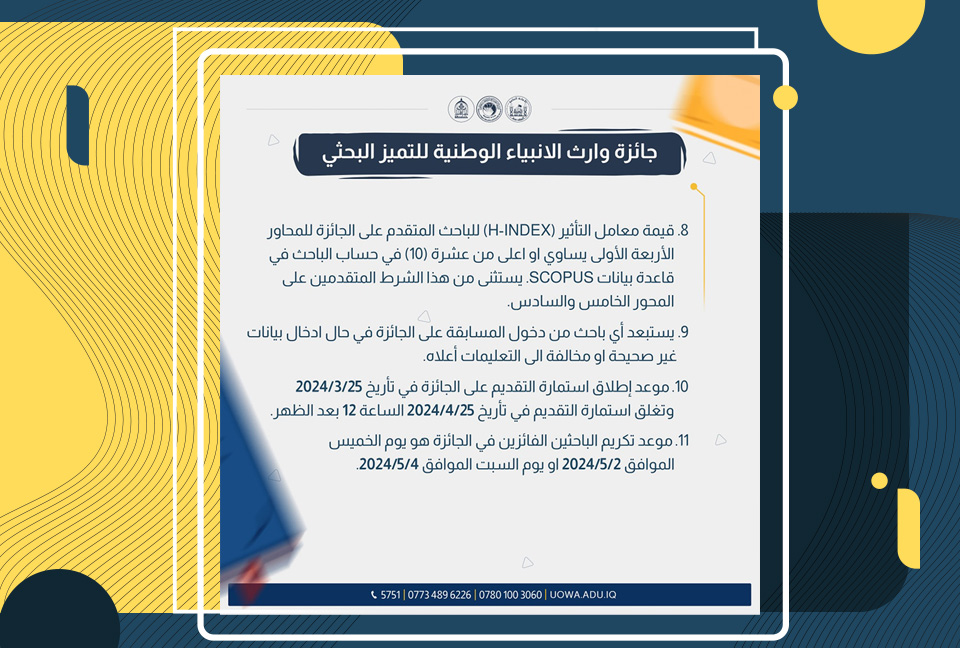 تأتي هذه الجائزة كفرصة مهمة لتقديم البحوث الرصينة والمساهمة في رفع مستوى البحث العلمي في العراق.