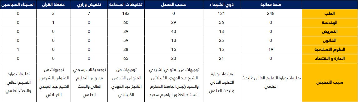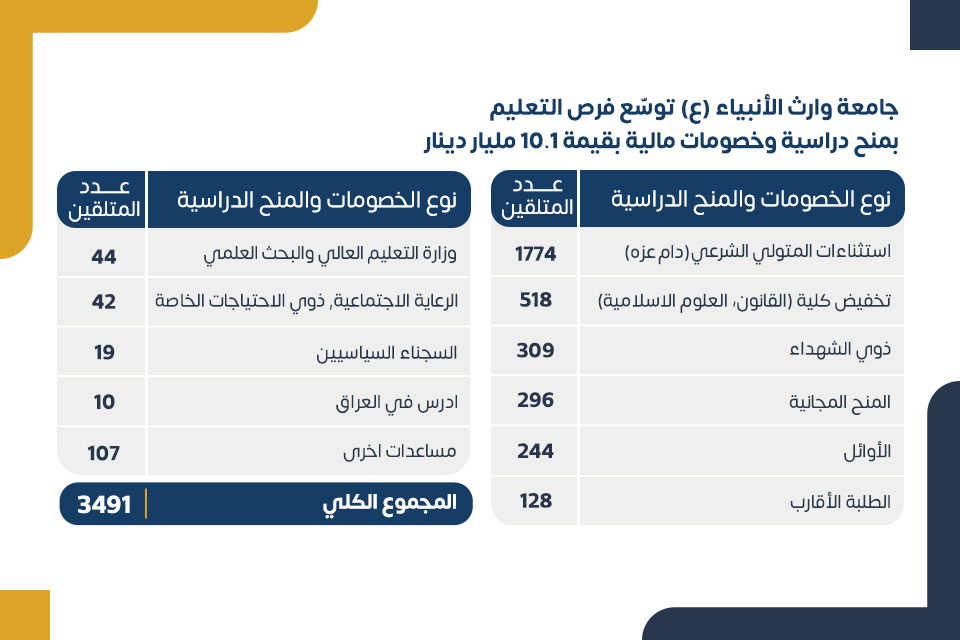 جامعة وارث الأنبياء (عليه السلام): التزامٌ راسخٌ بتوفير فرص التعليم للجميع تُعلن جامعة وارث الأنبياء (عليه السلام) عن إيمانها الراسخ بأهمية التعليم كحقٍ أساسيٍ من حقوق الإنسان وتماشيا مع معايير التنمية المستدامة ، وتُؤكّد على التزامها بتوفير فرص التعليم العالي لجميع الأفراد، بغض النظر عن خلفيتهم الاجتماعية والاقتصادية أو وضعهم المادي. وإيمانًا منّا بهذا الهدف النبيل، نُقدم مجموعة من الخصومات والمنح الدراسية الكاملة لعددٍ من الفئات المُستحقة، تشمل: الأفراد الذين لديهم أشقاء مسجلين في جامعتنا: حرصًا منّا على التخفيف من الأعباء المالية على العائلات، نُقدم خصوماتٍ مميزة للأشقاء المُسجّلين في جامعتنا. ذوو الإنجازات الأكاديمية الاستثنائية: نُكرم الطلبة المُتميزين ونُشجّعهم على الاستمرار في تفوقهم من خلال منحٍ دراسيةٍ كاملةٍ تُساعدهم على تحقيق إمكاناتهم الكاملة. حافظي القرآن الكريم: نُثمّن جهود حفظة القرآن الكريم ونُشجّعهم على مواصلة تعلّمهم من خلال منحٍ دراسيةٍ كاملةٍ تُتيح لهم فرصة الانضمام إلى جامعتنا. الأفراد من الأسر ذات الدخل المحدود: نُؤمن بأنّ فرص التعليم يجب أن تكون متاحةً للجميع، بغض النظر عن قدراتهم المادية، لذا نُقدم منحًا دراسيةً كاملةً للأفراد من الأسر ذات الدخل المحدود. خلال عام 2023، وصلت المساعدات المالية التي منحتها جامعة وارث الأنبياء (عليه السلام) لطلبتها الأعزاء إلى سبعة مليار دينار عراقي (7.000.000.000). اي ما يعادل 6 مليون دولار امريكي نُؤمن بأنّ هذه المنح والخصومات ستُساهم في تمكين الأفراد من تحقيق أحلامهم الأكاديمية والمهنية، كما ستُساعدهم على الإسهام بشكلٍ إيجابيٍ في مجتمعهم ككل. جامعة وارث الأنبياء (عليه السلام): نُؤمن بالتعليم للجميع.