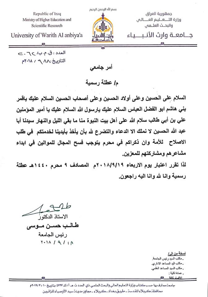 علما ان عنوان الجامعة هو كربلاء -طريق بغداد - قرب مدينة سيد الاوصياء