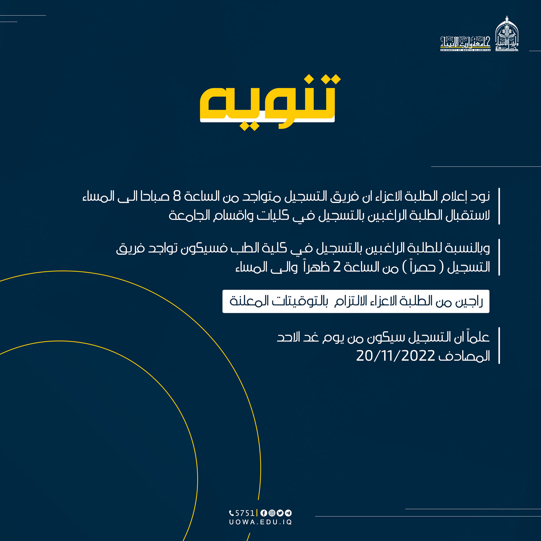 *نود اعلام الطلبة الاعزاء ان فريق التسجيل متواجد طيلة ايام الاسبوع(عدا يوم الجمعة) من الساعة 8صباحا