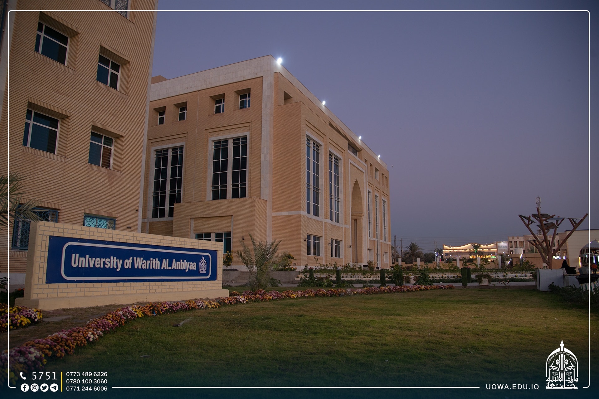 في رحاب جامعة وارث الانبياء(علبه السلام)، ننتظركم اليوم الاربعاء الموافق 23\11\2022 في حفل توزيع جوائز الفائزين بمسابقة وارث الانبياء للمبدعين والموهوبين في المدارس الثانوية في تمام الساعة ال10صباحاً