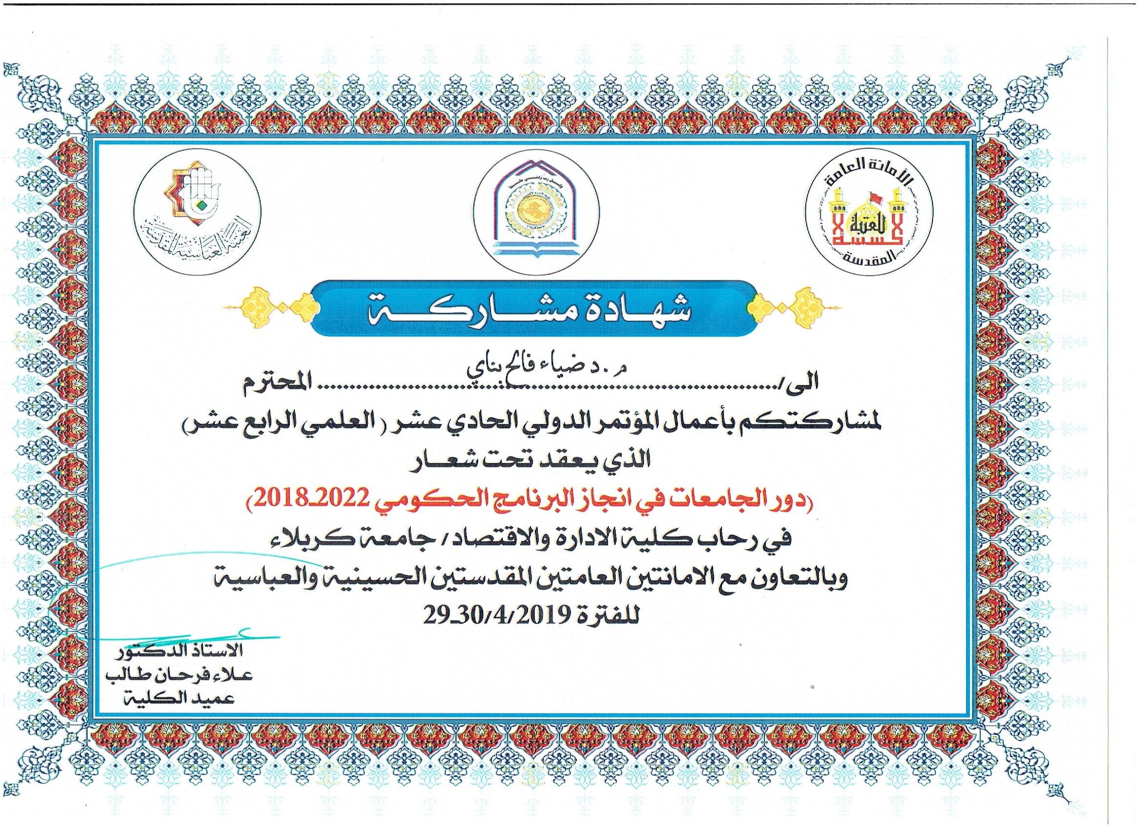 شارك التدريسي م.د ضياء فالح بناي في قسم ادارة الاعمال-كلية الادارة والاقتصاد في المؤتمر الدولي الحادي عشر (العلمي الرابع عشر) الذي اقامته  جامعة كربلاء كلية الادارة والاقتصاد ببحث تحت عنوان (اثر الادارة الرشيقة في البراعة التنظيمية)