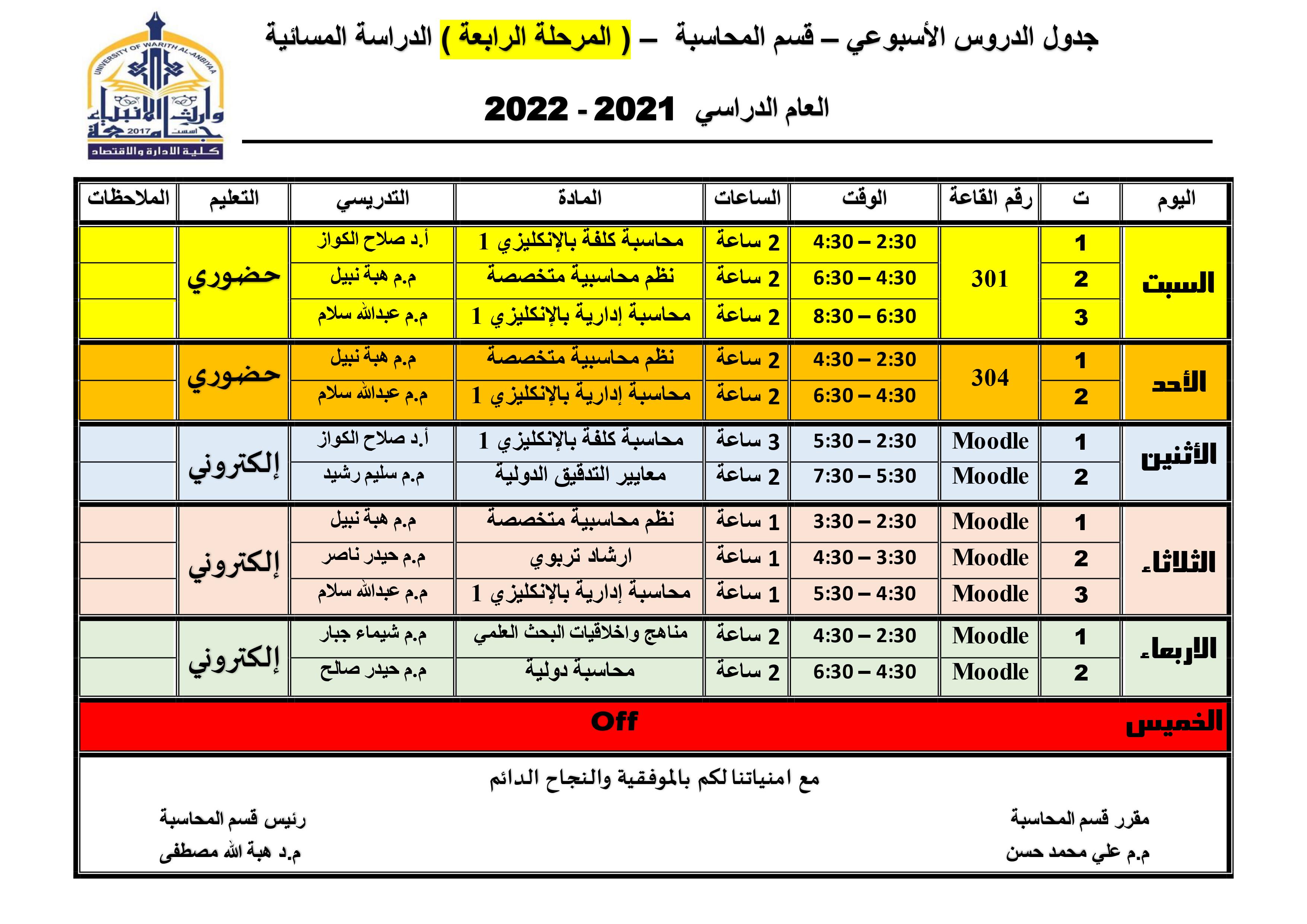 بسم الله الرحمن الرحيمالحمد لله رب العالمين والصلاة والسلام على رسول رب العالمين نبينا محمد وآله الطيبين الطاهرين، أما بعد.. مع بداية العام الدراسي الجديد ترحب عمادة كلية الادارة والاقتصاد وممثلتاً بعميدها أ. د عواد الخالدي ورئاسة قسم المحاسبة ممثلتاً برئيسها د. هبة الله مصطفى ومقرره م. م علي محمد حسن و مسؤول التعليم الإلكتروني د. محمد الحبوبي وجميع الأخوة والاخوات من تدريسي قسم المحاسبة ( مع حفظ الالقاب) بالطلبة الأعزاء في عامهم الدراسي الجديد ٢٠٢١/٢٠٢٢ متمين لكم دوام التوفيق والتفوق العالمي ان شاء الله و نستثمر هذه الفرصه لدعوتكم الى ان تكونوا في هذا الفصل الدراسي من المجتهدين في طلب العلم و تعكسوا أسمى معاني الأخلاق في التعامل وكذلك ندعوكم الى ان تكونوا عنونا لبعضكم البعض سائلين الموالي عز وجل أن يوفقكم لما يحب ويرضاه و يعينكم في تحقيق افضل درجات العلى والسلام عليكم ورحمة الله وبركاته