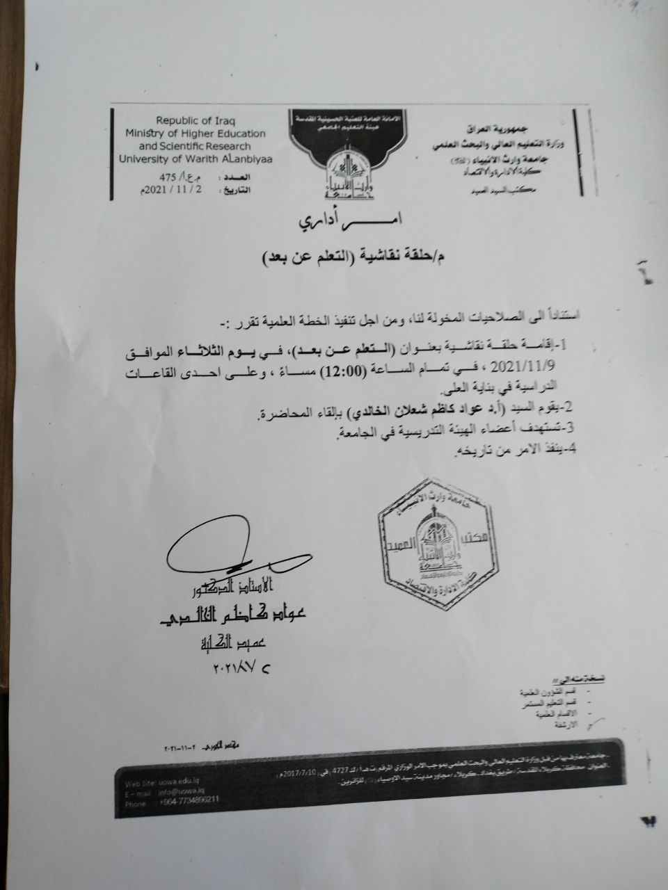 باسم السيد عميد كليه الاداره والاقتصاد الاستاذ الدكتور عواد كاظم شعلان الخالدي المحترم