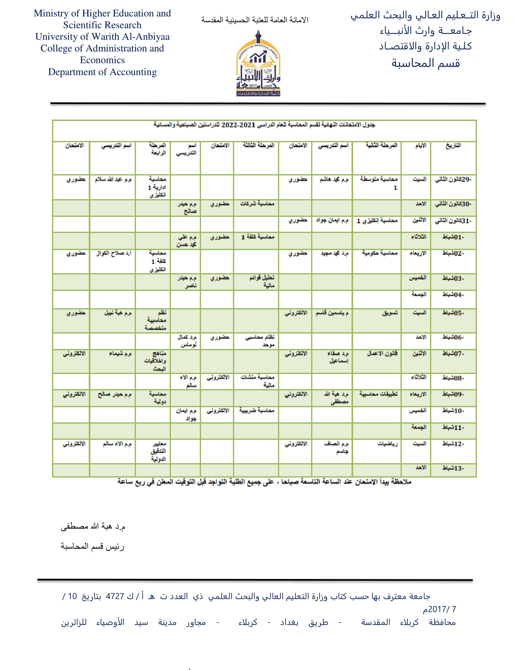 جدول الامتحانات النهائية لقسم المحاسبة للعام الدراسي 2021-2022 للدراستين الصباحية والمسائية