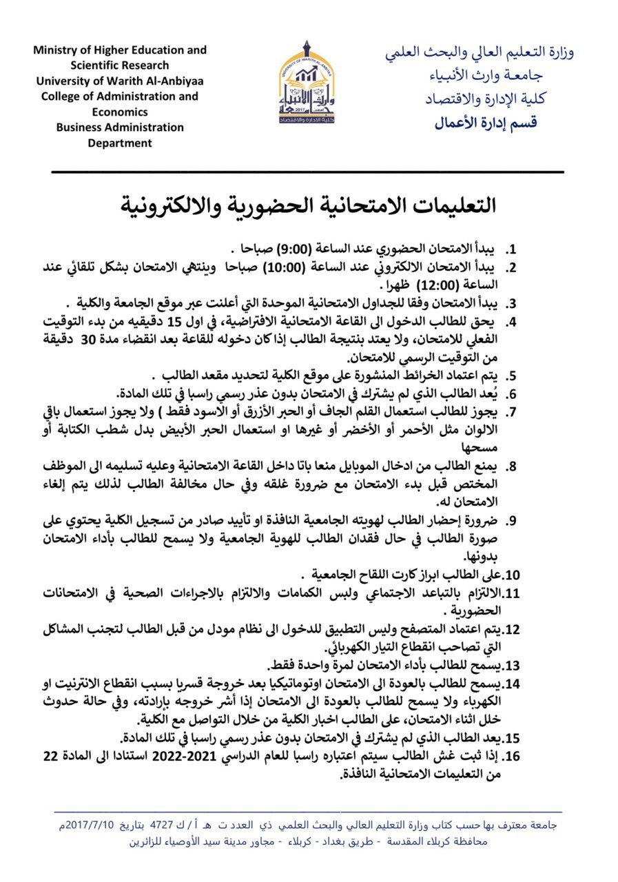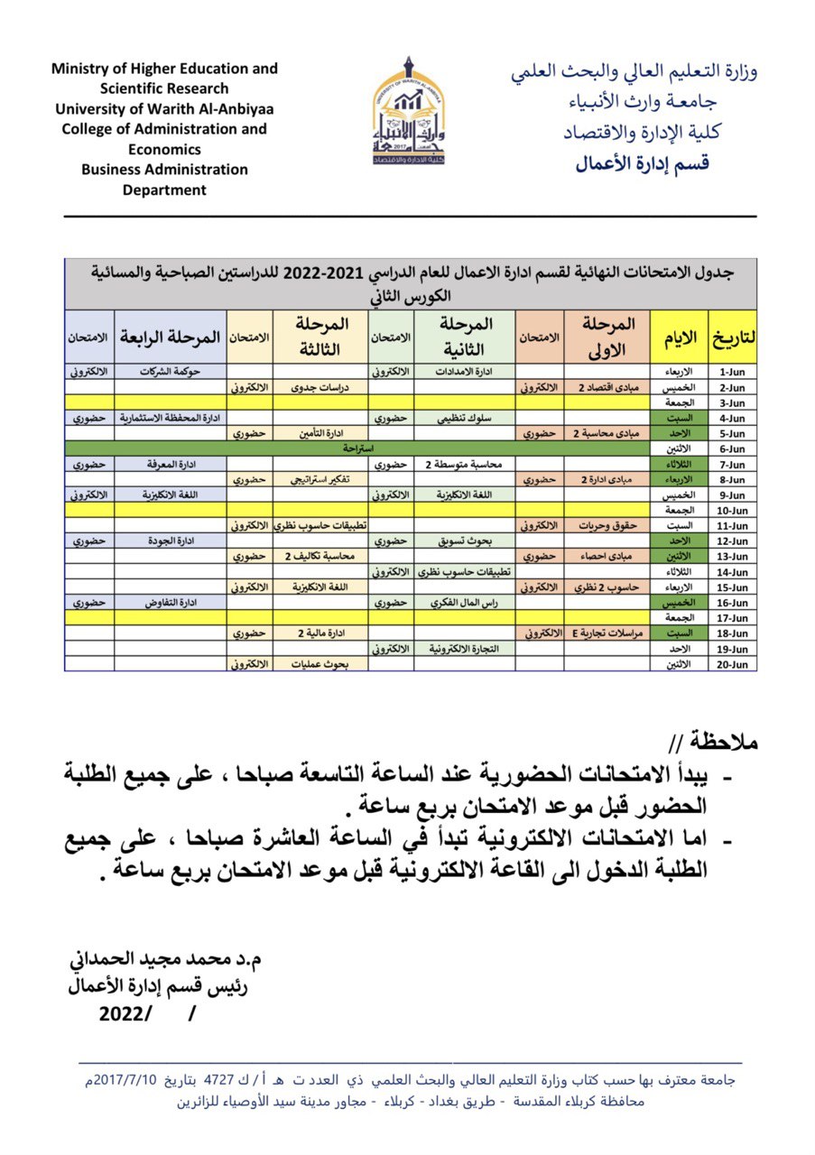 جدول امتحانات نهاية الكورس الثاني لكلية الادارة والاقتصاد / قسم الادارة2022/2021