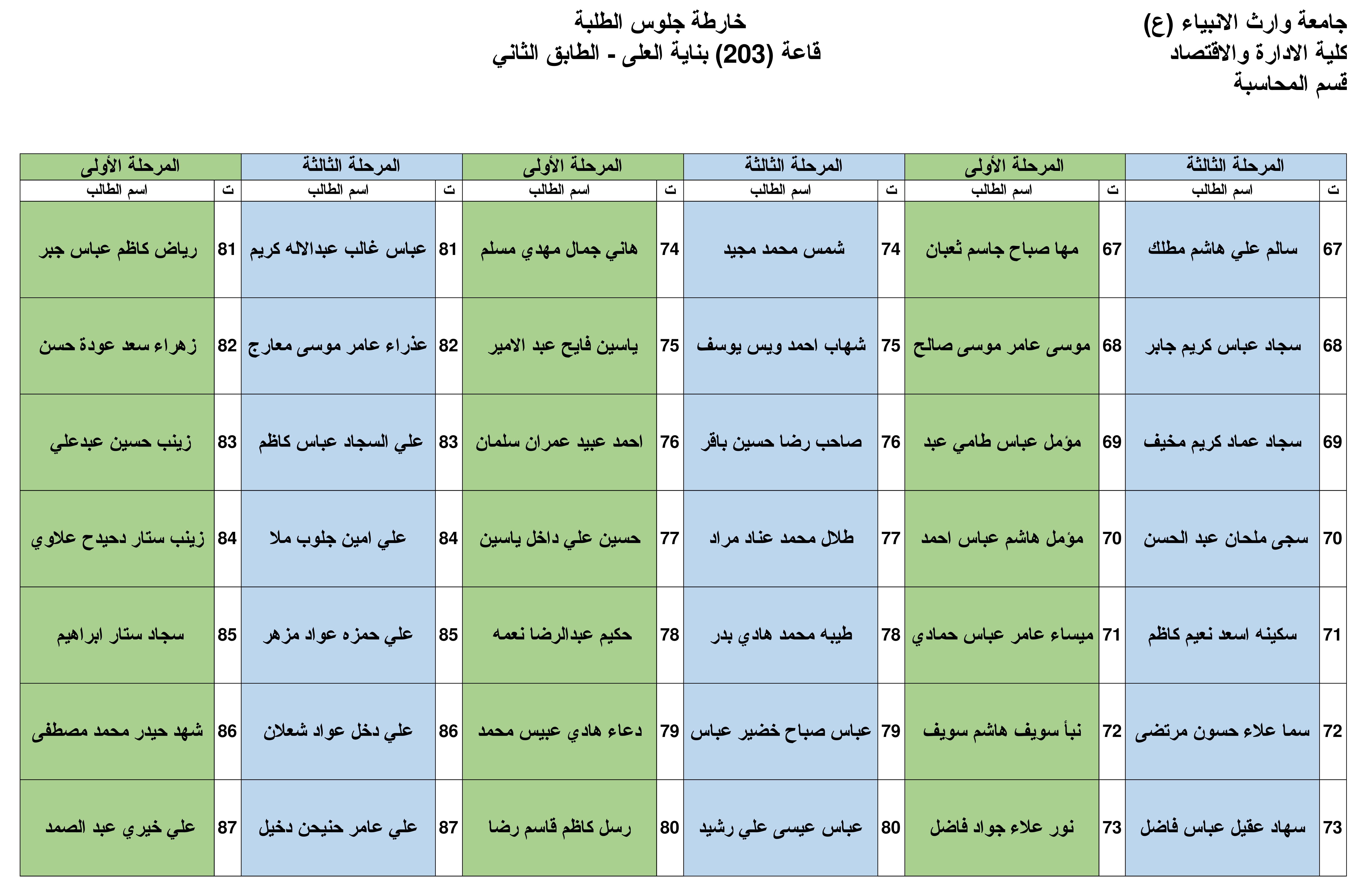 نرفق لكم خارطة الجلوس في القاعات الامتحانية لقسم المحاسبة للمرحلة الأولى والثالثة وكما موضحة في أدناه