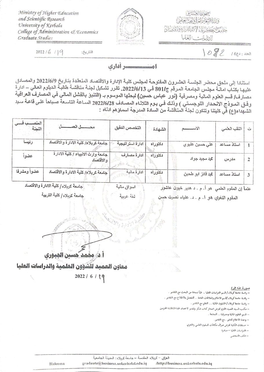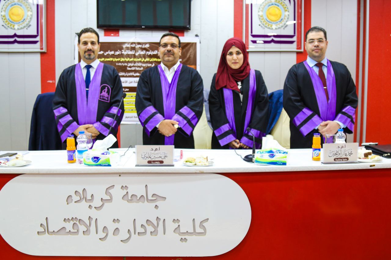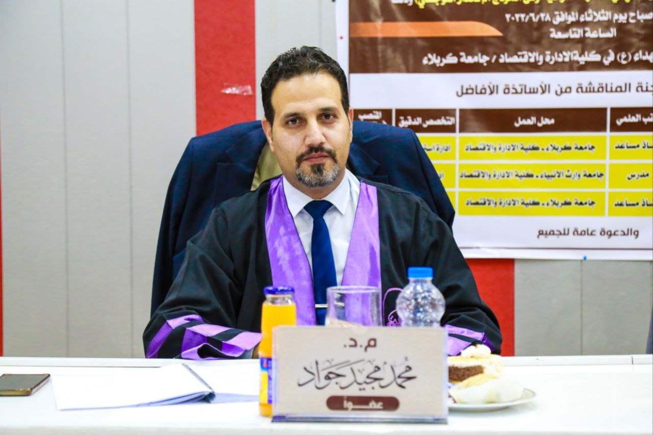 شارك رئيس قسم ادارة الاعمال الدكتور محمد مجيد الحمداني في عضوية مناقشة بحث الدبلوم العالي في جامعة كربلاء كلية الادارة والاقتصاد - قسم العلوم المالية والمصرفية في يوم الثلاثاء الموافق 28/6/2022 للبحث الموسوم ( التنبؤ بالفشل المالي في المصارف العراقية وفق انموذج الانحدار اللوجستي ) للطالبة نور عباس حسين ، وتألفت لجنة المناقشة من: