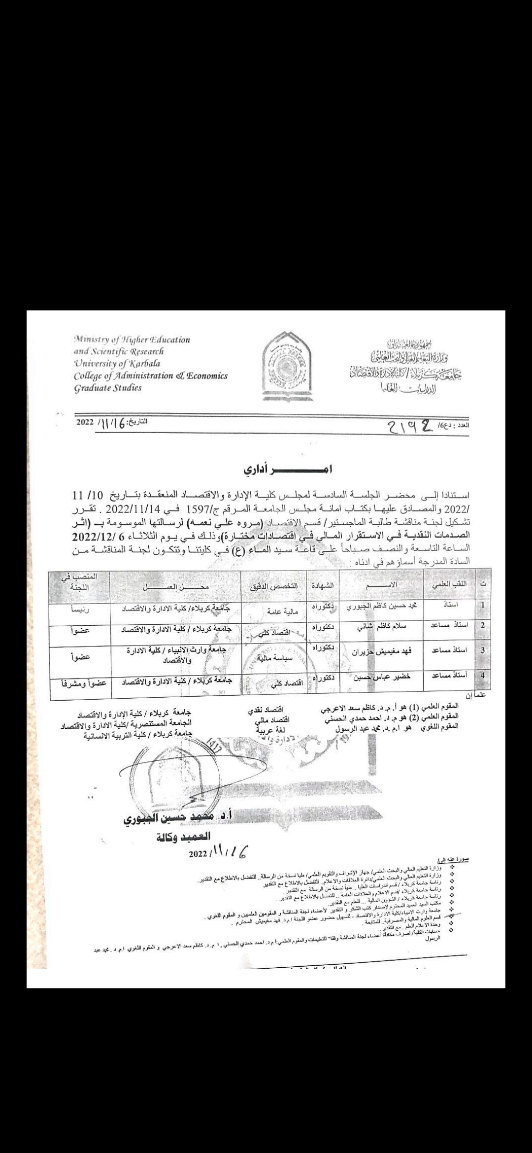 معاون عميد كلية الادارة والاقتصاد جامعة وارث الأنبياء عضوا في لجنة مناقشه