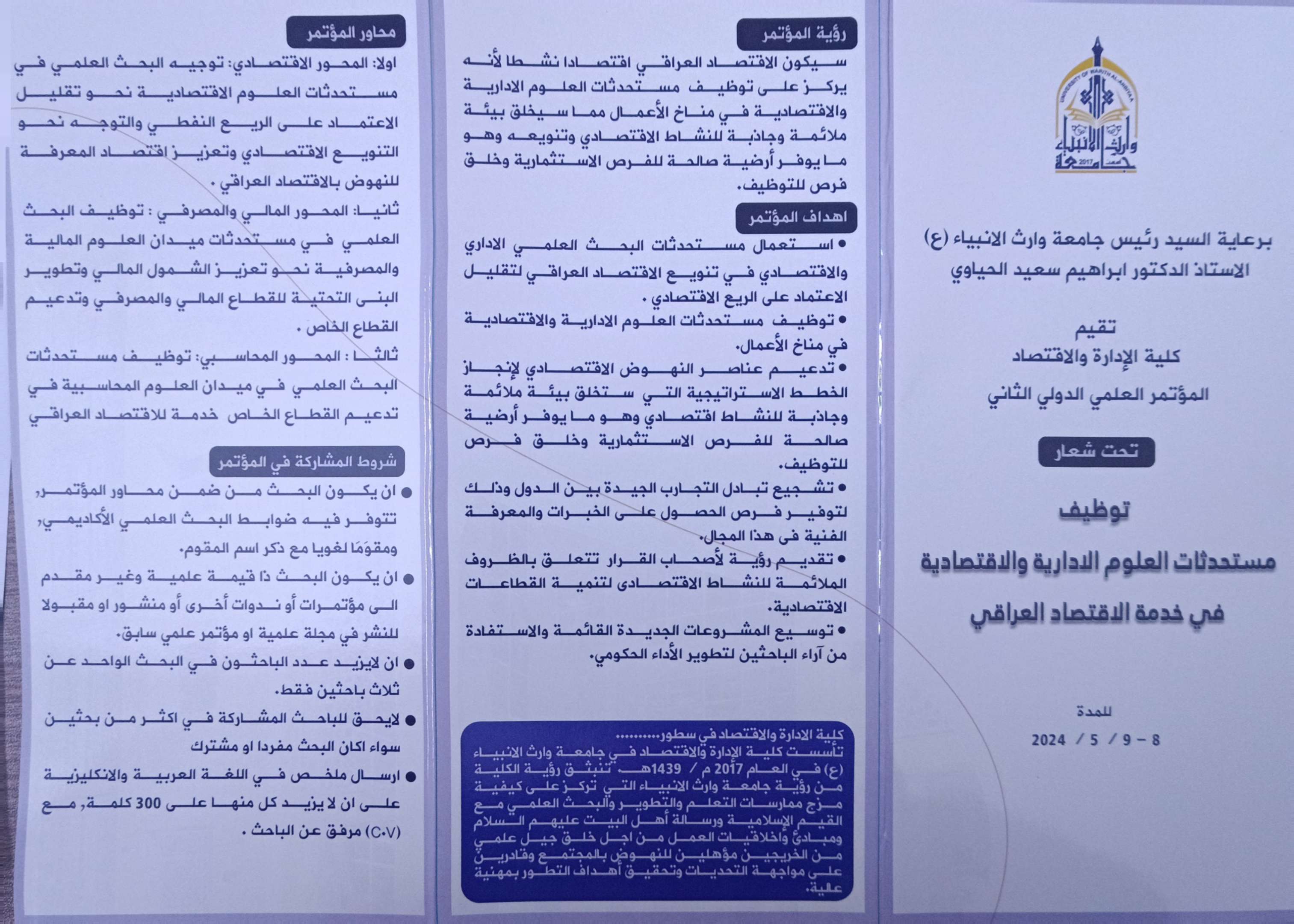 تقيم كلية الادارة والاقتصاد مؤتمرها العلمي الدولي الثاني تحت شعار توظيف مستحدثات العلوم الادارية والاقتصادية في خدمة الاقتصاد العراقي في تأريخ