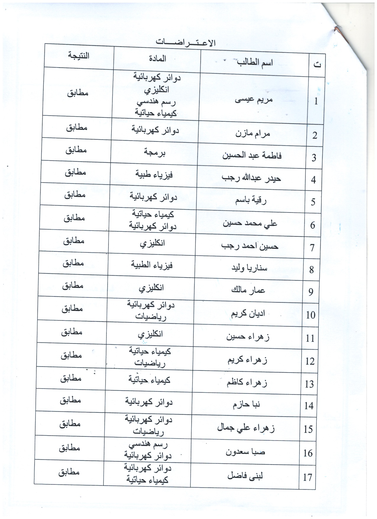 بعد تدقيق الاعتراضات المقدمة النتائج مطابقة