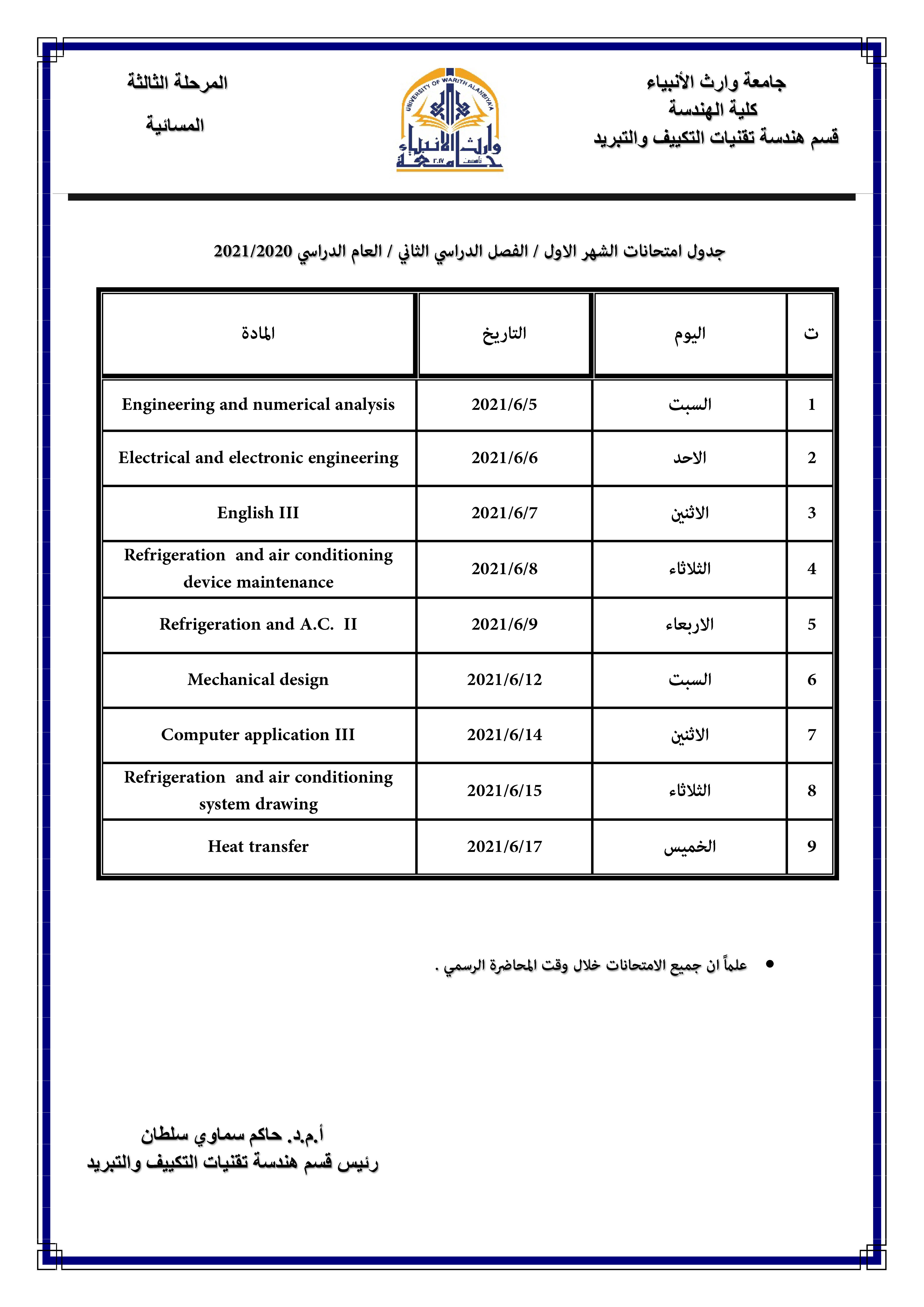 يقيم قسم هندسه الطب الحياتي بالتعاون مع قسم التعليم المستمر في جامعه وارث الأنبياء سلسلة من الحلَقات النقاشية الحضورية ابتداءاً من يوم الأحد المصادف 30/5/2021 و كما في الجدول المرفق.