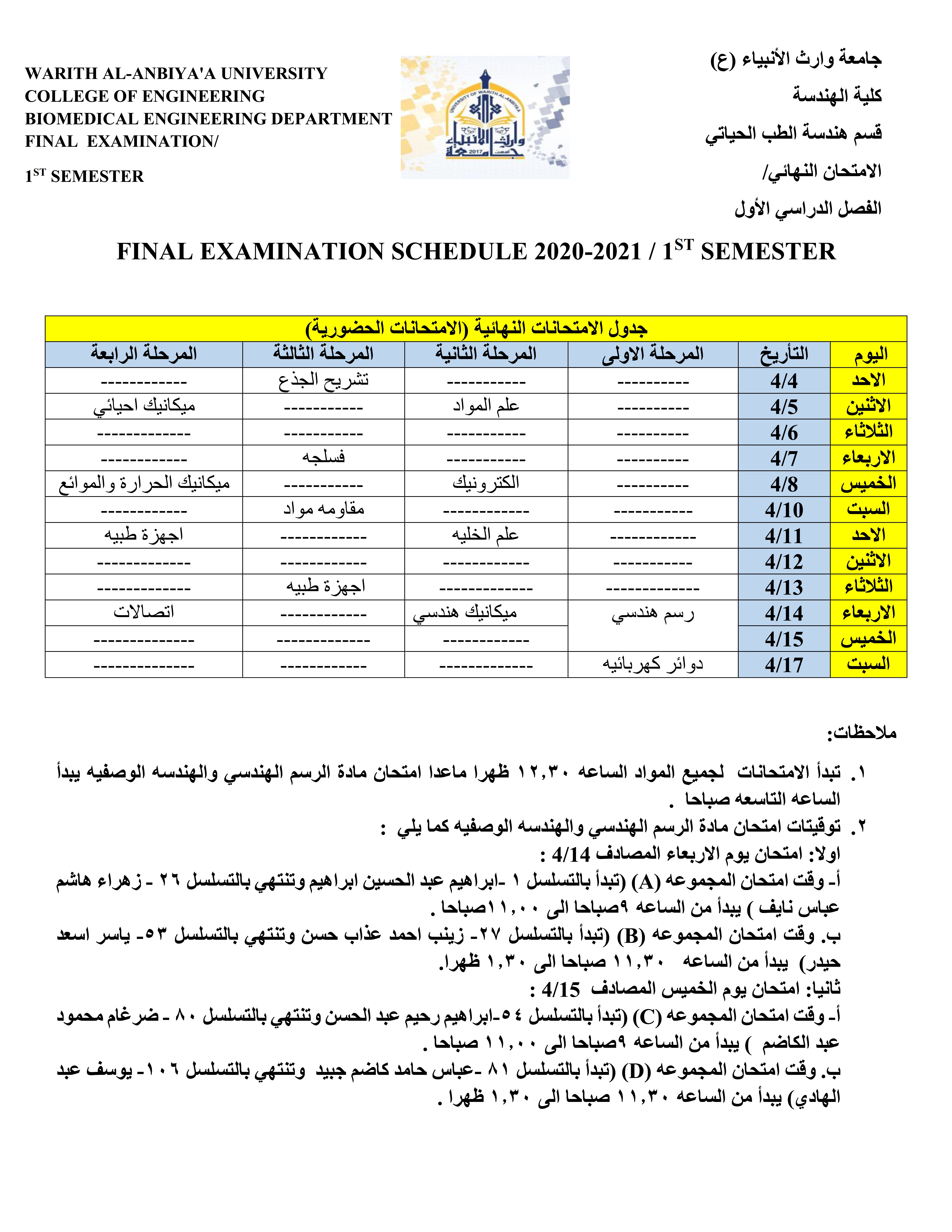 نرفق أليكم جداول الامتحانات الحضورية لجميع الأقسام العلمية