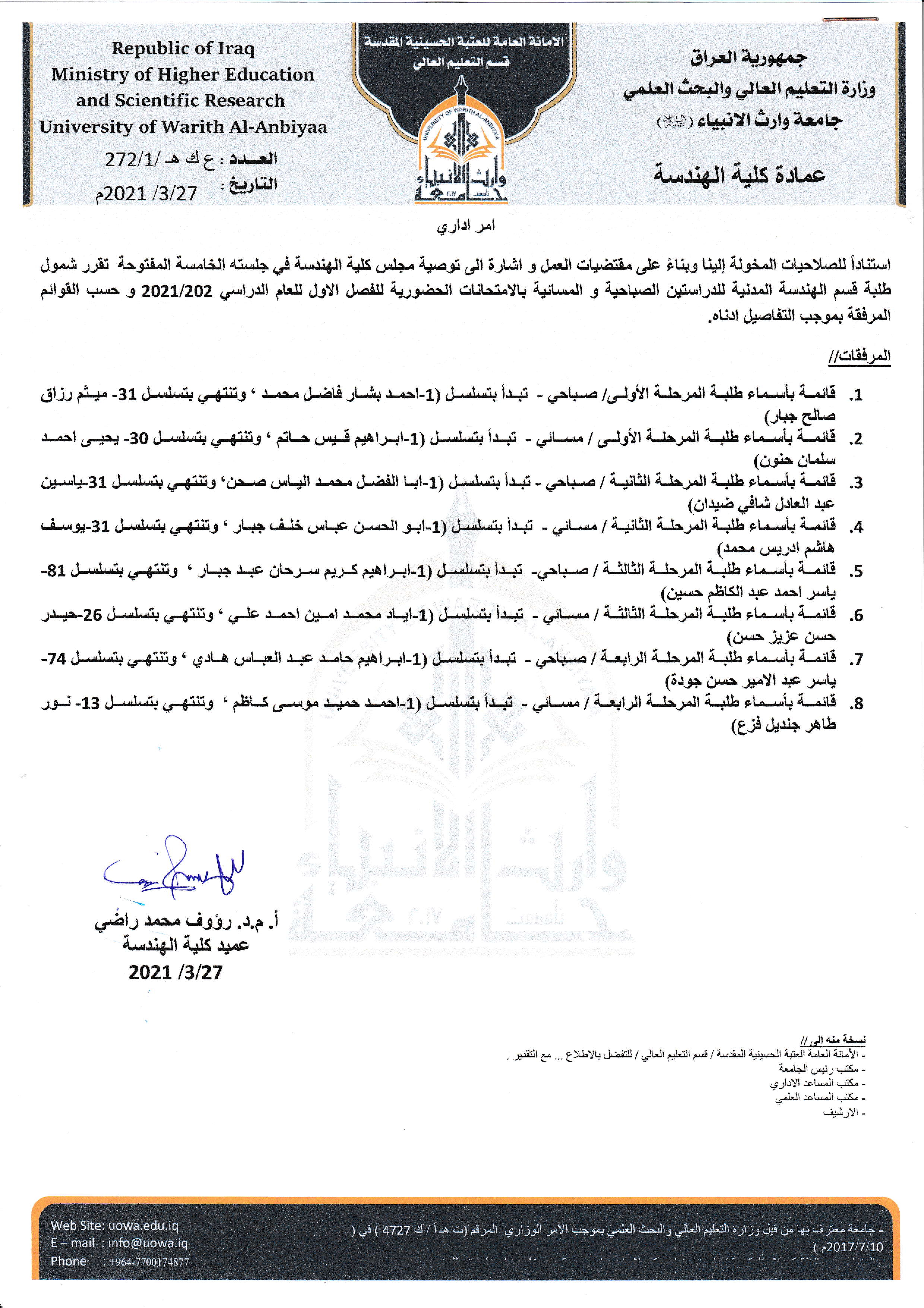 أدناه قوائم الأسماء الخاصة بالطلبة المشمولين بالامتحانات الحضورية لقسم الهندسة المدنية.