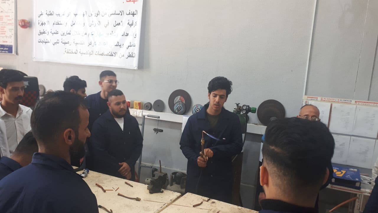 جانب من المحاضرات العملية لورشة اللحام لطلبة قسم هندسة تقنيات التكييف والتبريد حيث تدرب الطلبة على اجراء اللحام الغازي بأستخدام غازي الاوكسي استلين والمستخدم في التطبيقات الصناعية لمجال التكييف والتبريد