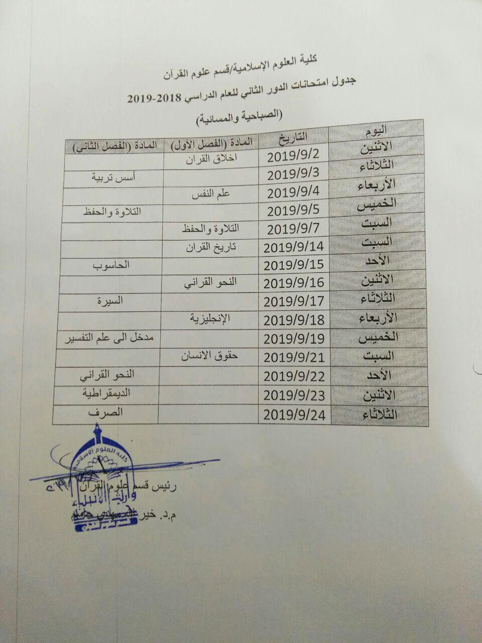 جدول امتحانات الدور الثاني للعام الدراسي 2018-2019 لقسمي (الفقه واصوله, علوم القران)