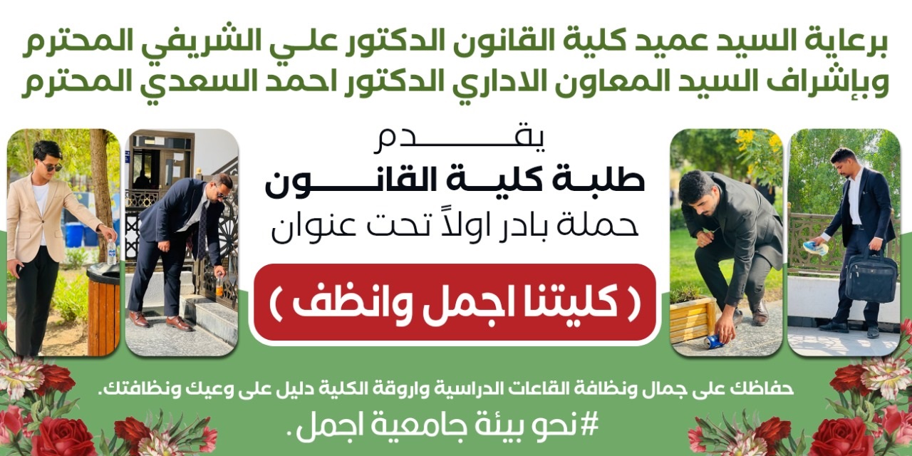 إقامة  طلبة  كلية القانون باشراف السيد عميد الكلية والسيد المعاون العملمي نشاط طلابي بعنوان " بادر اولا نحو بيئة جامعية أجمل وأنظف" هو مبادرة رائعة تساهم في تحسين بيئة الجامعة وتشجيع الطلاب على الوعي البيئي والمشاركة الفعّالة على تحسين بيئة الحرم الجامعي من خلال تعزيز النظافة والوعي البيئي بين الطلاب  وجعل الجامعة أكثر نظافة وجمالًا، حيث يتعاون الجميع للحفاظ على البيئة الجامعية واتباع أسلوب حياة مستدام.