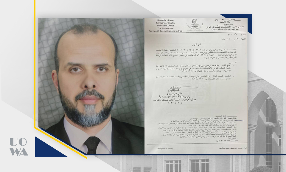 تتقدم كلية الطب – جامعة وارث الأنبياء متمثلةً بالسيد عميد كلية الطب الاستاذ الدكتور علي عبد سعدون الغزي المحترم بأحر التهاني والتبريكات إلى الدكتور علاء عبد الرحمن حبيب بمناسبة حصوله على شهادة الزمالة التدريبية في طب الطوارئ من المجلس العربي للاختصاصات الصحية في العراق.