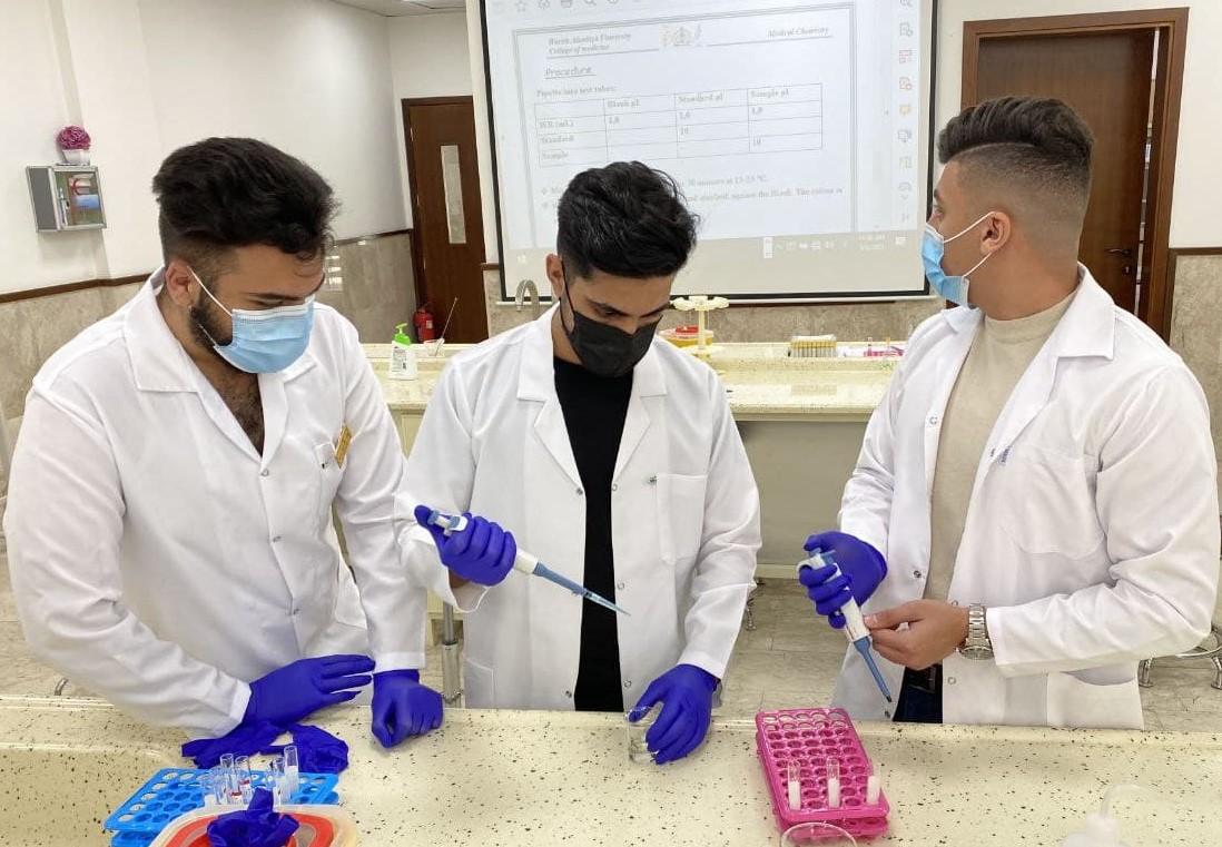 يعمل مختبر الكيمياء الطبية و الحياتية على تعليم طلاب المرحلة الاولى على الاسس الرئيسية لفهم التراكيز المختلفة لمختلف المواد الكيميائية وكذلك على تعلم اسس وقواعد اجراء مختلف التفاعلات الكيميائية المهمة من الناحية الصحية والطبية وكذلك يعلم طلبة المرحلة الثانية كيفية تشخيص مختلف الامراض عن طريق قياس تراكيز الاختبارات المتعلقة بتلك الامراض كمستوى السكر والدهون وقياس فعاليات الكبد في الدم وكذلك على تعلم كيفية القياس بسحب الدم بصورة سليمة من الشخص المريض .