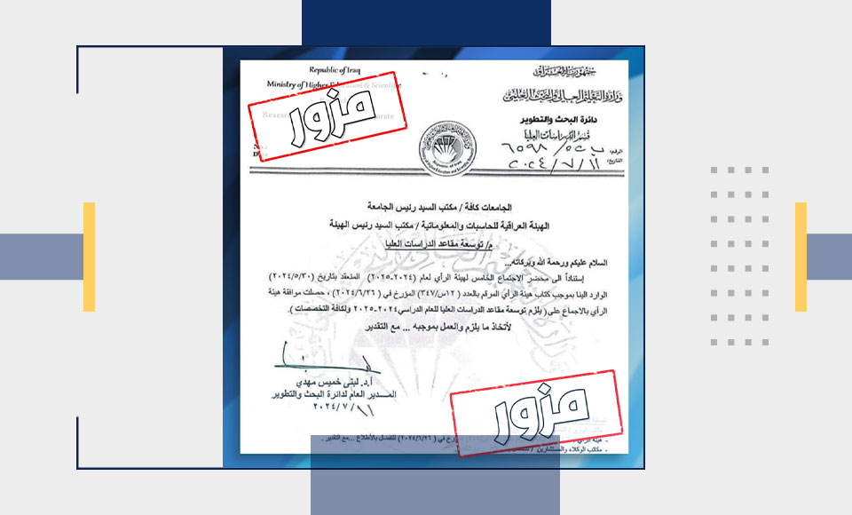 حذرت وزارة التعليم العالي والبحث العلمي من تداول كتاب مزور يتعلق بتوسعة القبول في الدراسات العليا.