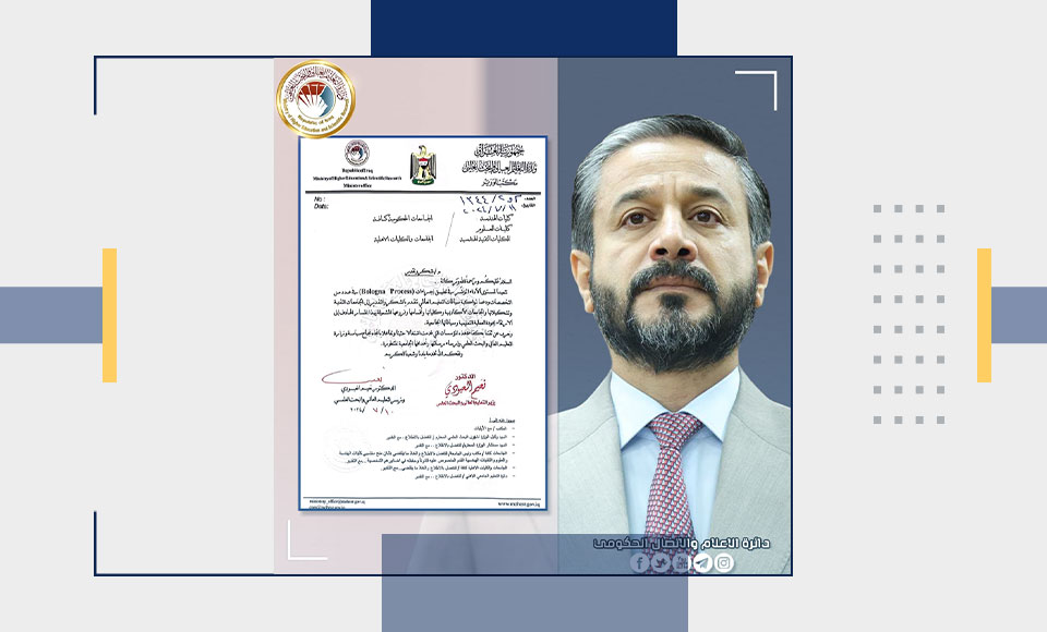وجه وزير التعليم العالي والبحث العلمي، الدكتور نعيم العبودي، كتاب شكر وتقدير إلى الجامعات والتشكيلات التي طبقت إجراءات (Bologna Process).