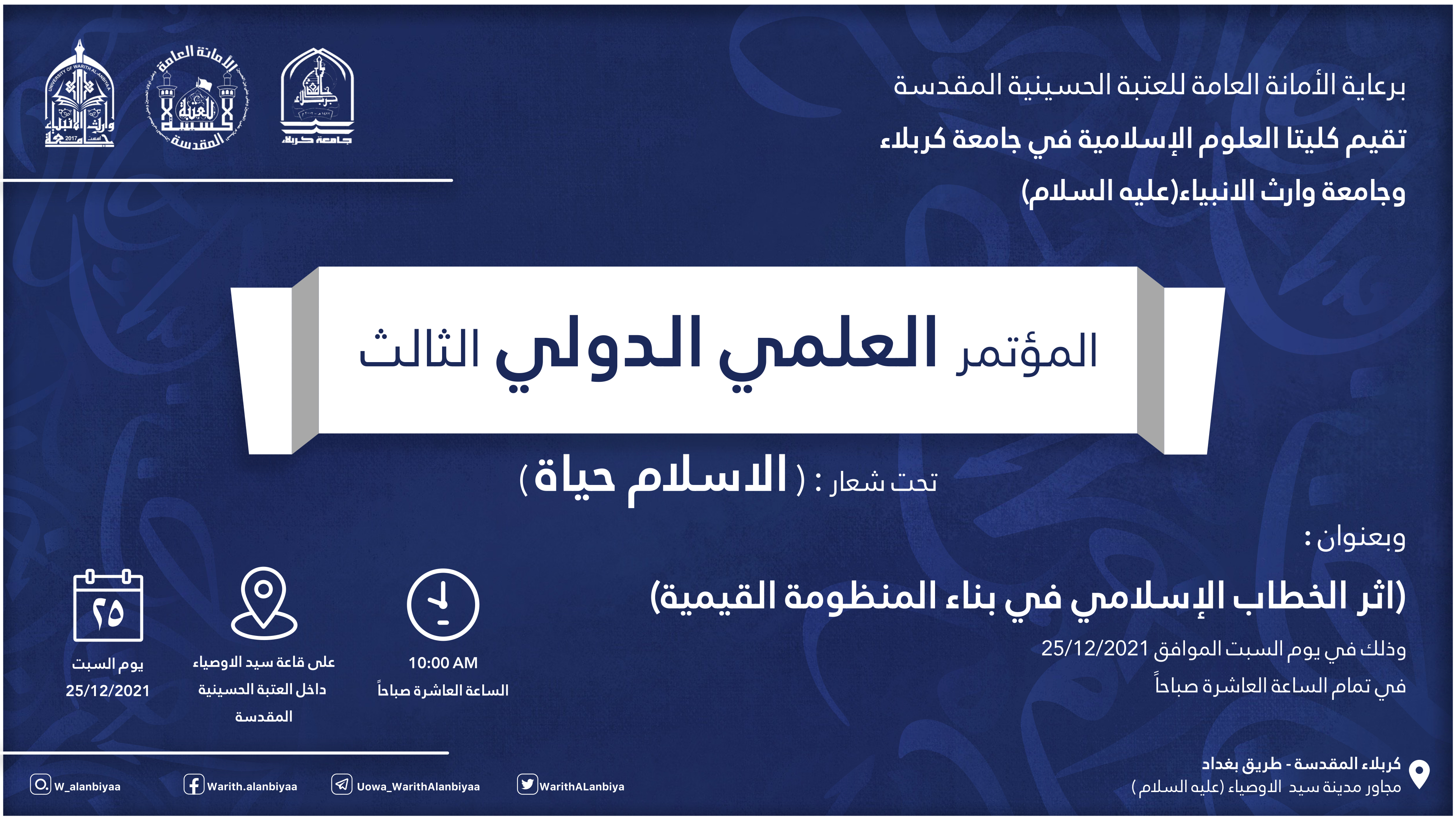 برعاية الأمانة العامة للعتبة الحسينية المقدسة وبحضور السيد رئيس هيئة التعليم الجامعي في العتبة الحسينية المقدسة الاستاذ الدكتور حيدر التميمي والسيد رئيس الجامعة الاستاذ الدكتور ابراهيم سعيد الحياوي أقامت كليتا العلوم الاسلامية في جامعة وارث الانبياء(عليه السلام) وجامعة كربلاء مؤتمرهما العلمي الدولي الثالث تحت شعار (الاسلام حياة) وبعنوان (اثر الخطاب الإسلامي في بناء المنظومة القيمية) على قاعة سيد الاوصياء(عليه السلام) داخل العتبة الحسينية المقدسة بمشاركة باحثين من العراق وليبيا ومصر والجزائر ولبنان وايران حيث وصلت عدد بحوث المؤتمر الى77 بحث علمي