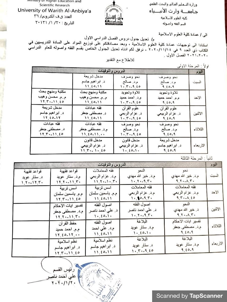 جدول الدروس اليومي للمرحلة الثانية / الدراسة الصباحية والمسائية / قسم علوم القرآن