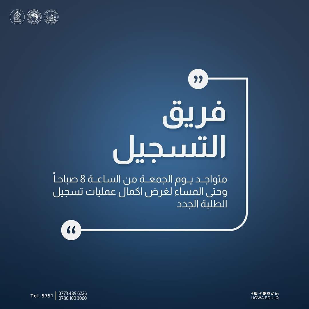 نود اعلام الطلبة الاعزاء ان فريق التسجيل متواجد طيلة ايام الأسبوع من الساعة ٨صباحاً الى ٥ مساءً (عدا يوم الخميس والجمعة من الساعة ٨صباحاً الى٢ مساء)