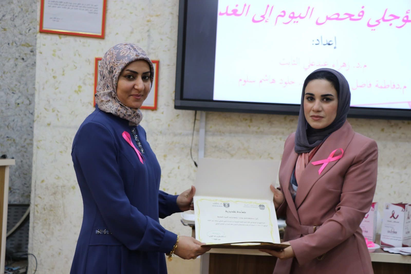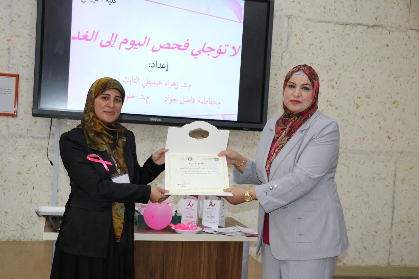 اقامت تدريسيات من كلية التمريض في جامعة وارث الانبياء متمثله بكل من م .د زهراء عبد علي الثابت ، م. د خلود هاشم ، م .د فاطمه فاضل نشاطا توعويا مميز حول سرطان الثدي في كلية الاداب جامعة بابل