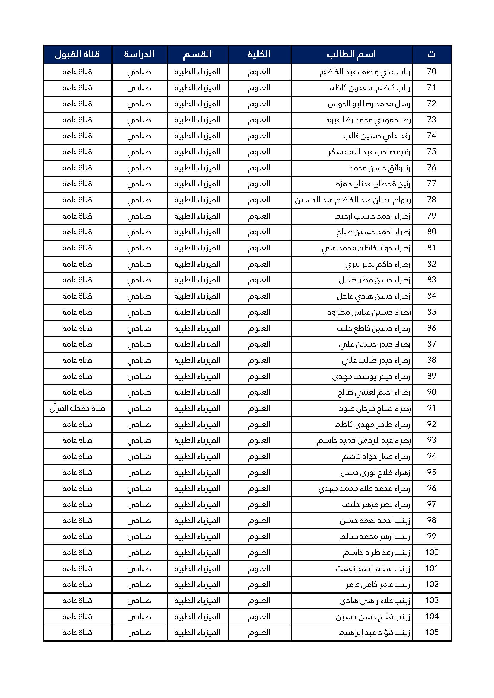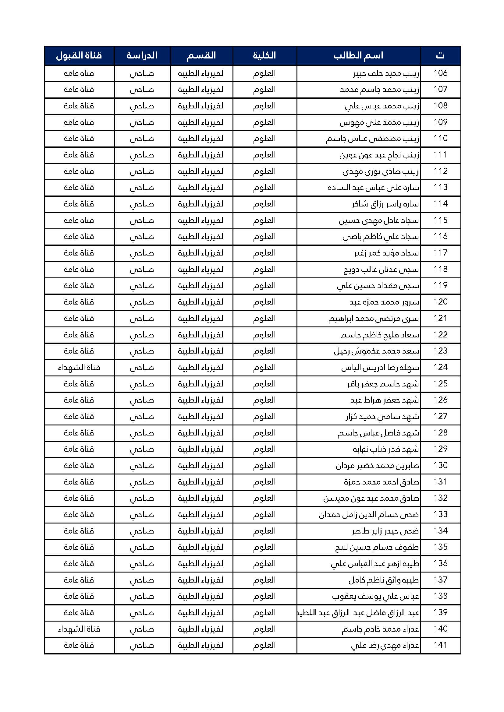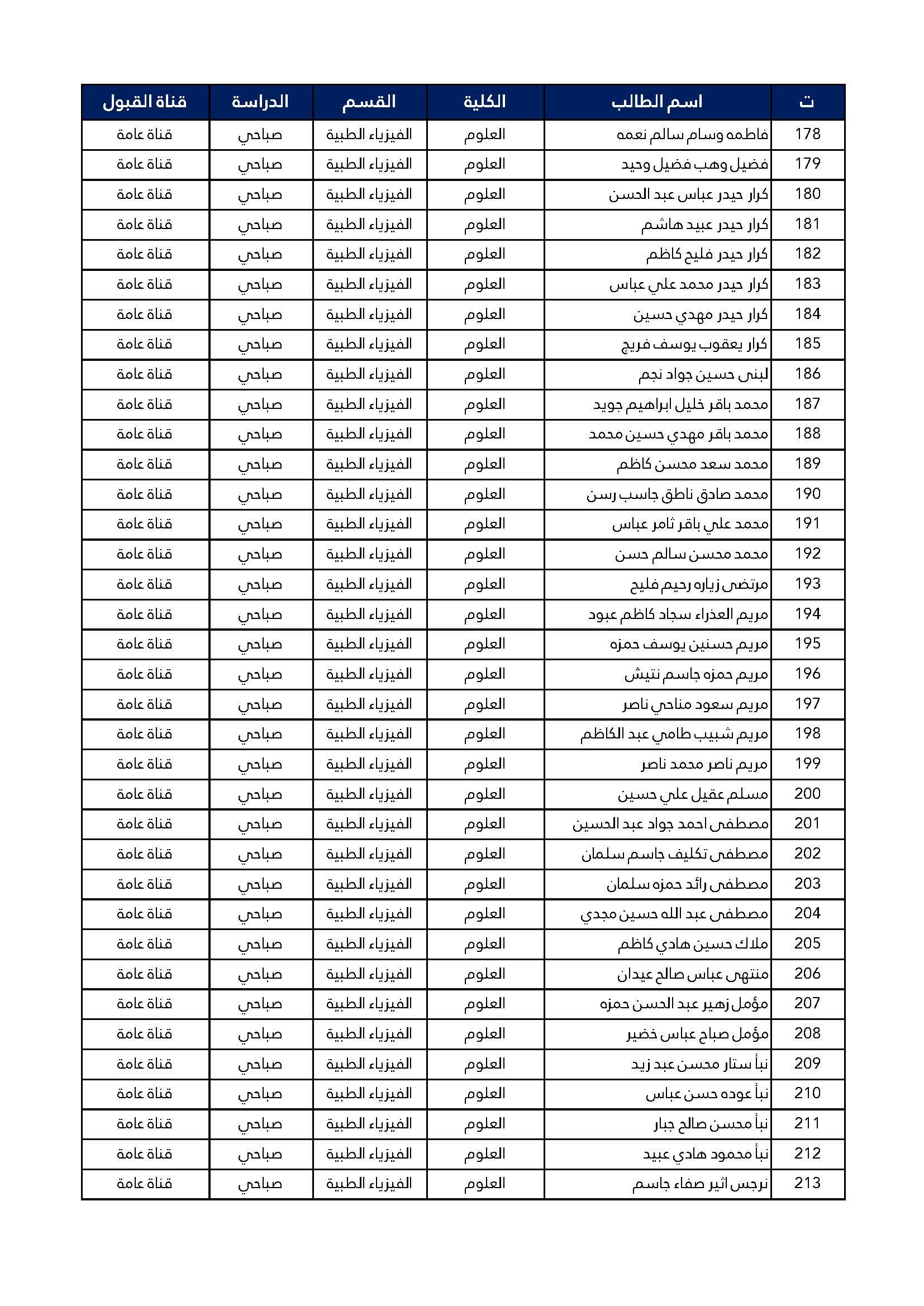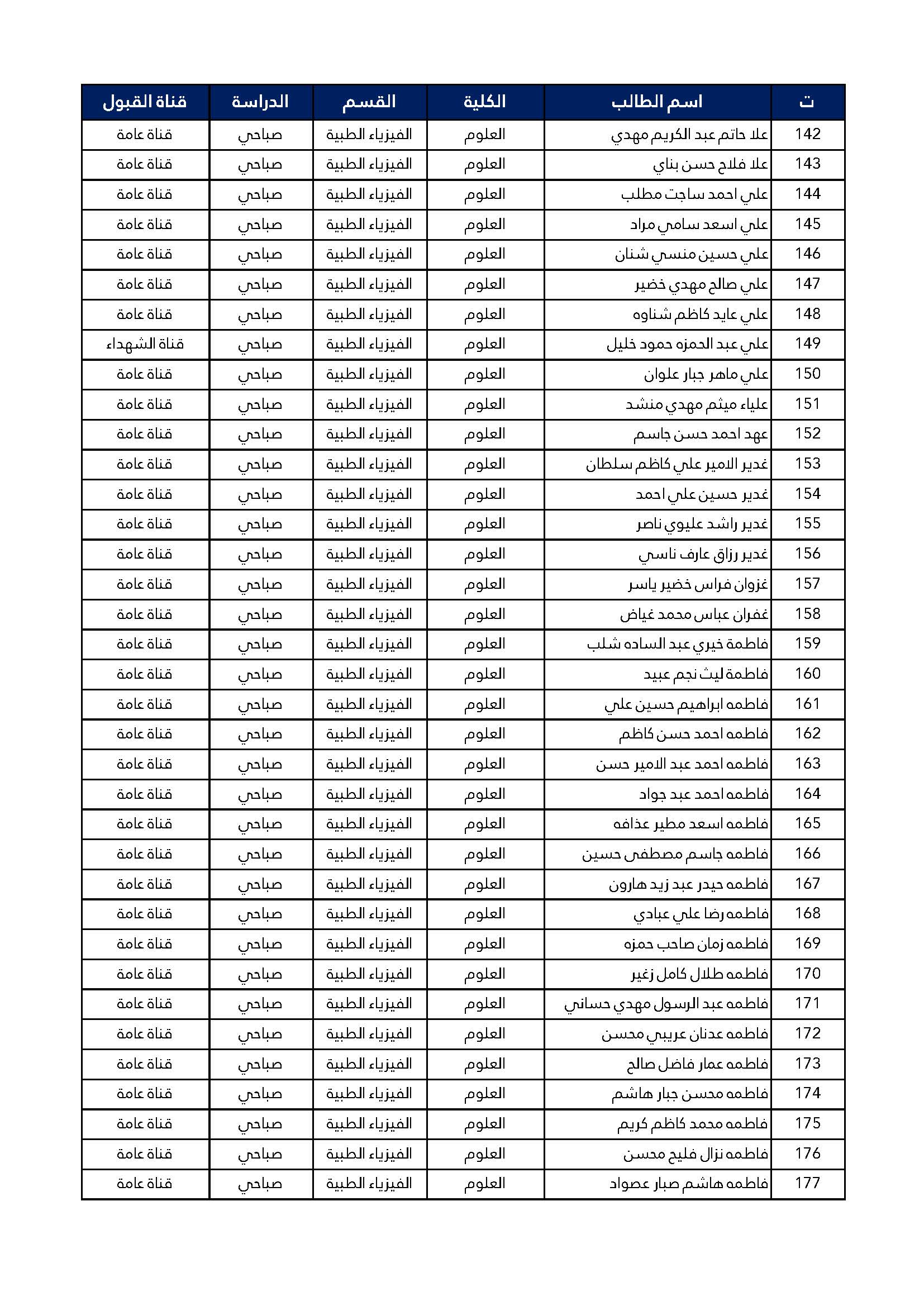 اسماء الطلبة المقبولين للدراسة الصباحية للمرحلة الاولى كلية العلوم قسم الفيزياء الطبية