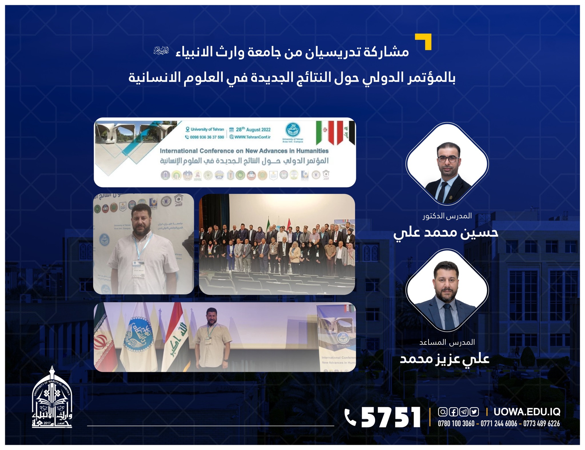 شارك التدريسيان في كلية الادارة والاقتصاد/قسم ادارة الاعمال، م.د حسين محمد علي، و م.م. علي عزيز الكلكاوي في "المؤتمر الدولي حول النتائج الجديدة في العلوم الانسانية" الذي تقيمه جامعة طهران بمشاركة واسعة لعدد من الدول العربية والعالمية.