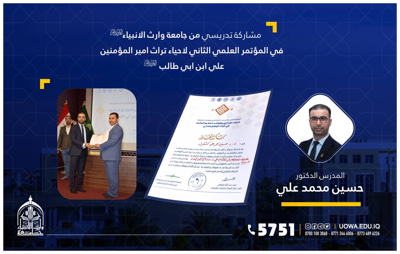 شاركت جامعة وارث الأنبياء في المؤتمر العلمي الثاني لإحياء تراث أمير المؤمنين علي بن أبي طالب (عليه السلام) الذي تقيمه الأمانة العامة للعتبة العلوية المقدسة وبالتعاون مع جامعة الكوفة من خلال كليتا الادارة والاقتصاد والآداب والذي جاء بعنوان (البعد الإداري وقواعد الحكم الرشيد في تراث أمير المؤمنين عليه السلام)