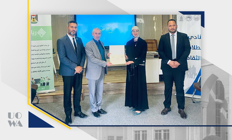 نظّم النادي الطلابي الثقافي في جامعة وارث الأنبياء (عليه السلام) فعالية "متميزون" لتكريم الطالبة هاجر حسين من كلية الهندسة – قسم الطب الحياتي، بعد فوزها ضمن الثلاثة الأوائل على محافظة كربلاء في المسابقة الوطنية (أمة تقرأ).