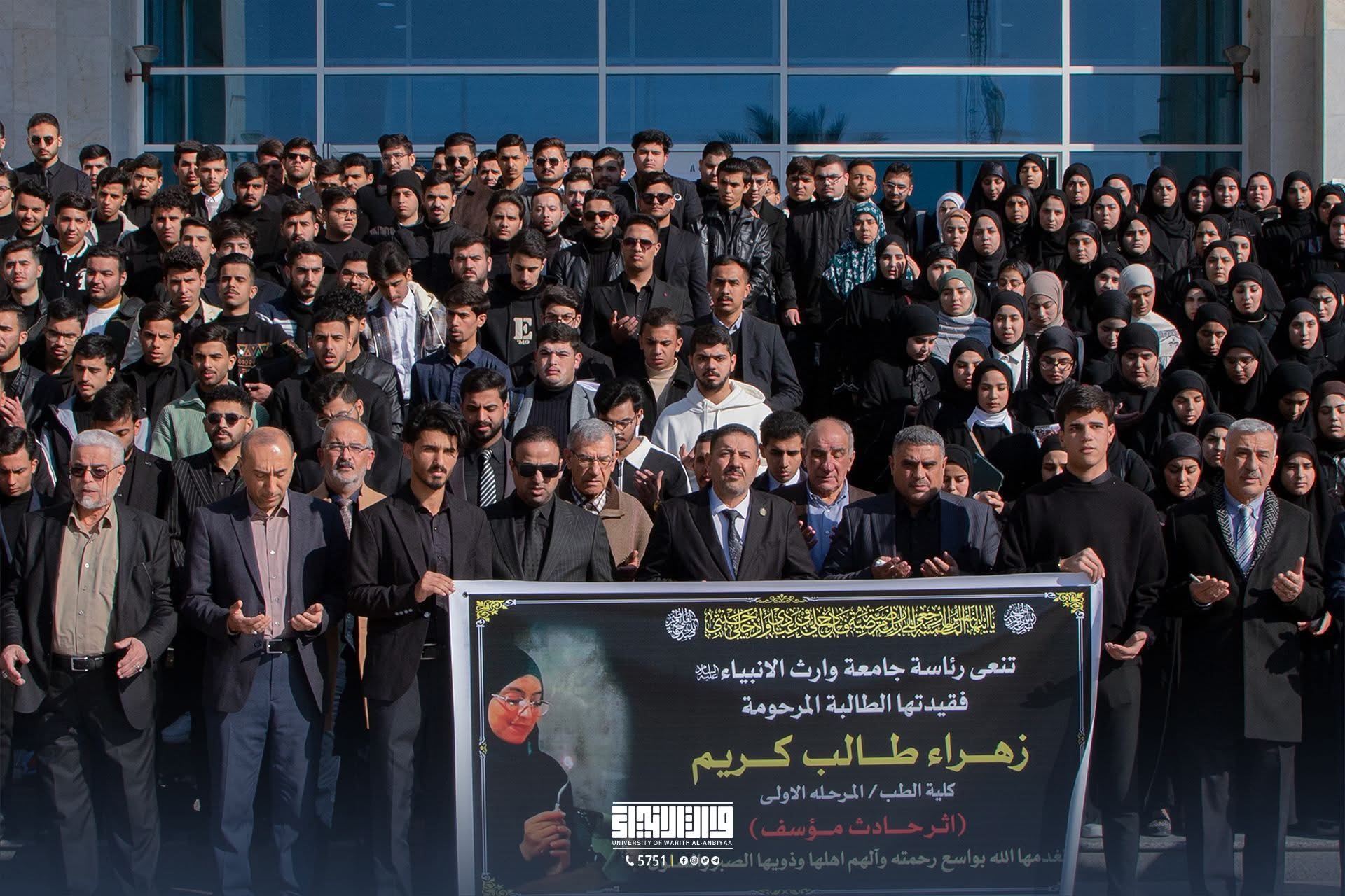 نظمت عمادة وطلبة كلية الطب في جامعة وارث الأنبياء (عليه السلام) وقفة حداد على روح الطالبة المرحومة زهراء طالب كريم، حيث تمت قراءة سورة الفاتحة ترحماً على روحها الطاهرة.