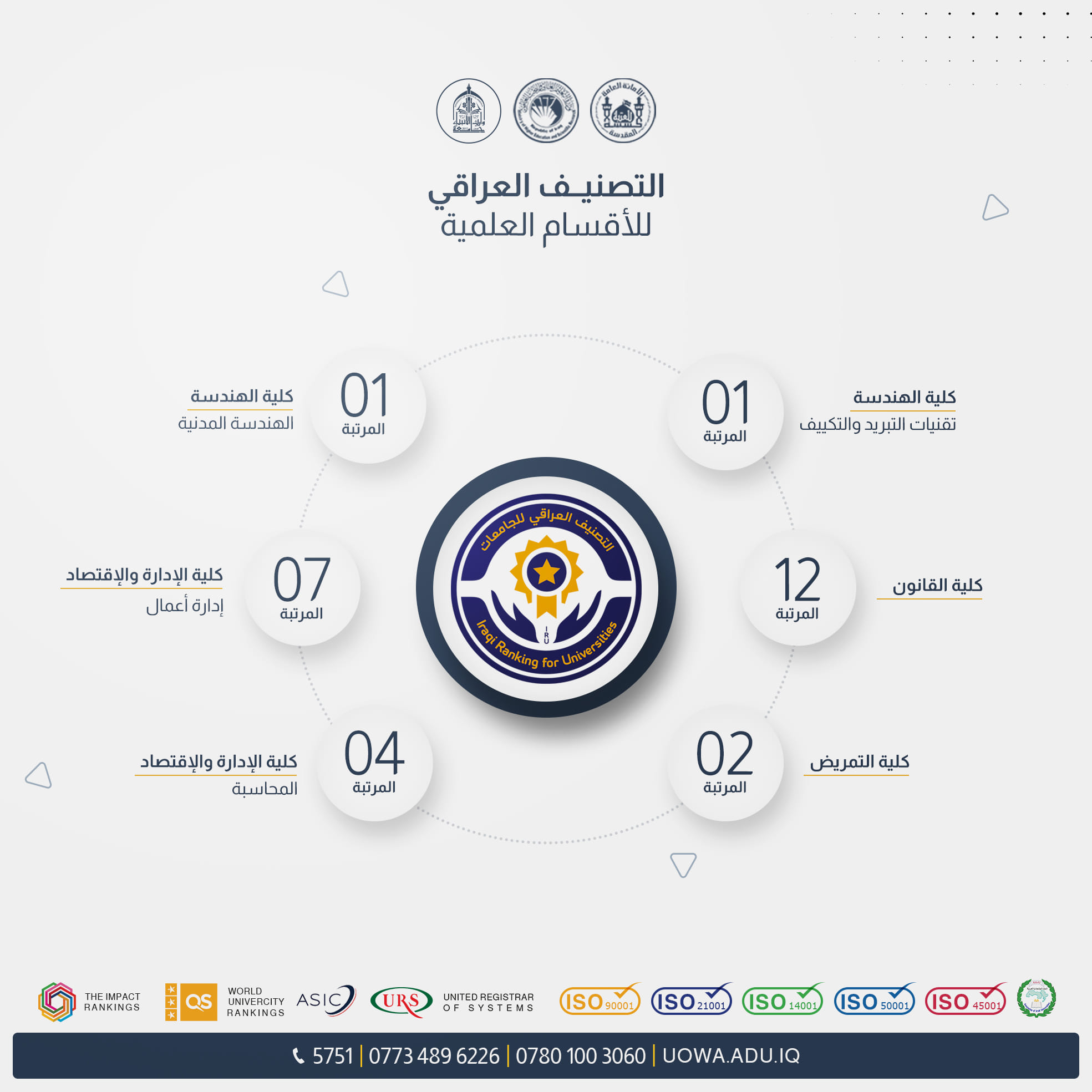 أعلنت وزارة التعليم العالي والبحث العلمي، من خلال جهاز الاشراف والتقويم العلمي، نتائج "التصنيف العراقي للأقسام العلمية" للجامعات الحكومية والأهلية، حيث تألقت جامعة وارث الأنبياء (عليه السلام) بتحقيق إنجازات متميزة في عدد من التخصصات.