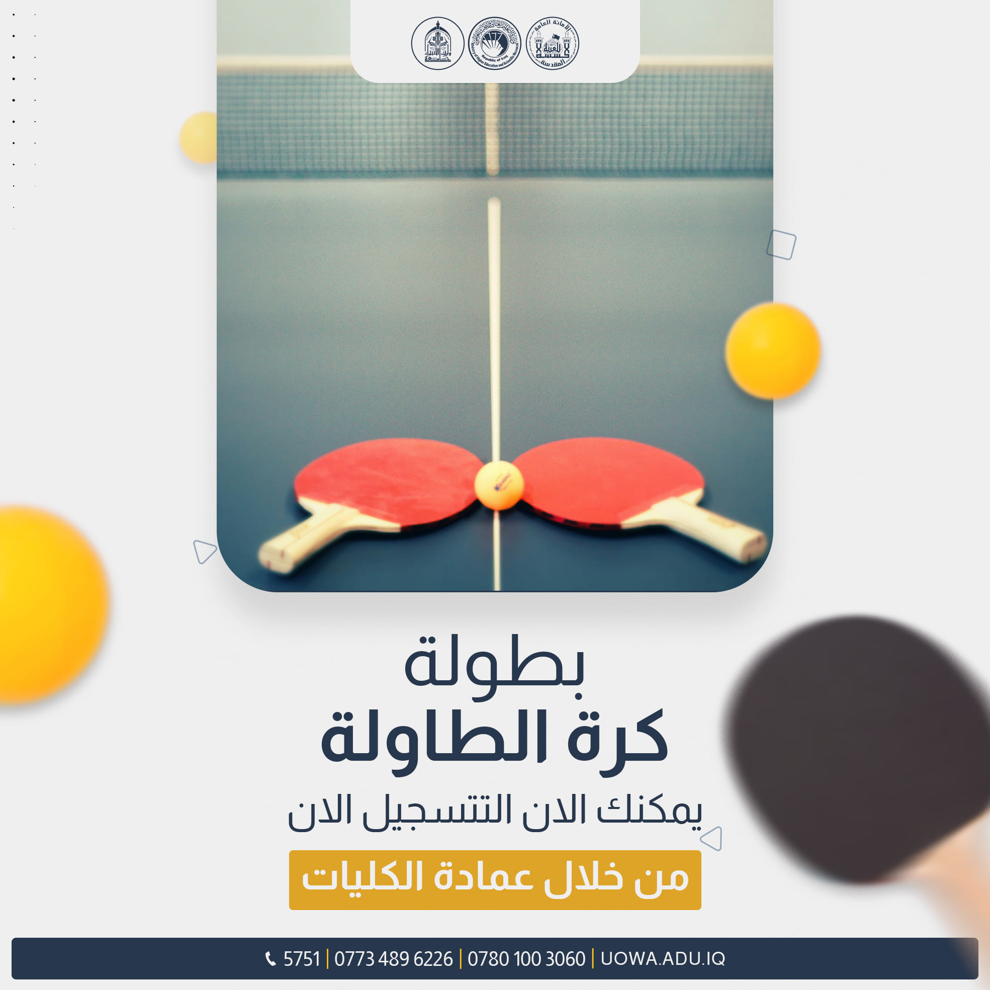يقيم قسم النشاطات الطلابية في جامعة وارث الانبياء(عليه السلام) بطولة كرة الطاولة (المنضدة) لطلبة كليات وأقسام الجامعة كافة، فعلى من يود المشاركة مراجعة رئاسة قسمه لتسجيل أسمه.