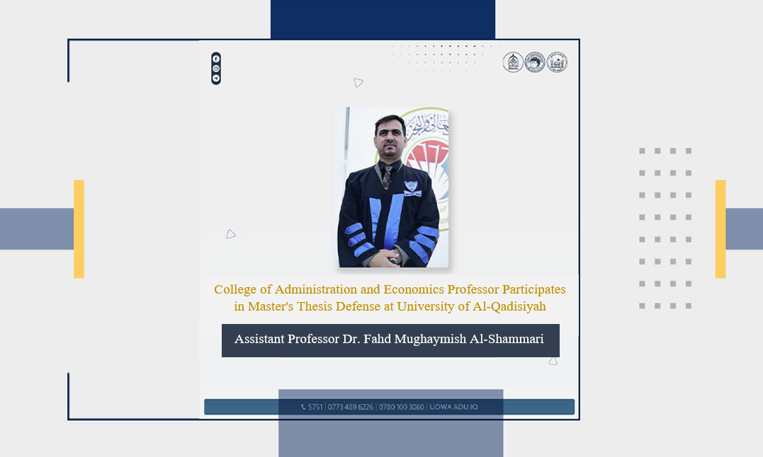 Dr. Fahd Mughaymish Al-Shammari, Assistant Professor at the College of Administration and Economics, University of Warith Al-Anbiyaa (PBUH), was selected to serve as a member of the examination committee for a master’s thesis defence in the Department of Financial and Banking Sciences at the University of Al-Qadisiyah.
