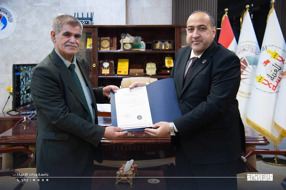 The President of Warith Al-Anbiyaa University, Professor Dr Ibrahim Saeed Al-Hayyawi, honoured Professor Dr Abdul Kareem Abdullah Mahmoud, Head of the Community Medicine Branch at the College of Medicine, on the occasion of his being awarded the title of Distinguished Professor, in recognition of his outstanding academic career and his scholarly contributions to medical education and scientific research.