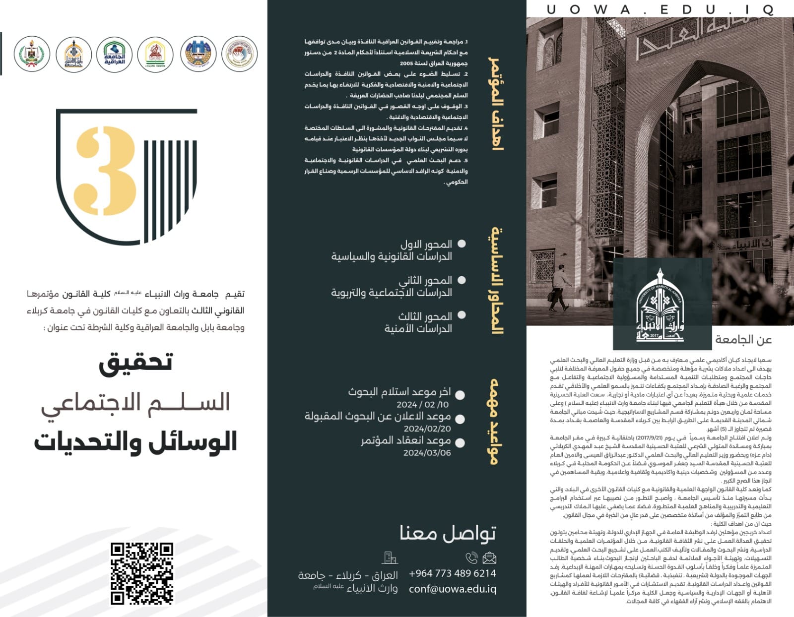 The College of Law at the University of Warith Al-Anbiyaa is pleased to invite researchers and academics to participate in its "Third Law Conference" scheduled under the theme "Social Peace: Means and Challenges". This comes in collaboration with the Colleges of Law at the University of Karbala, University of Babylon, University of Baghdad, and the Police College.