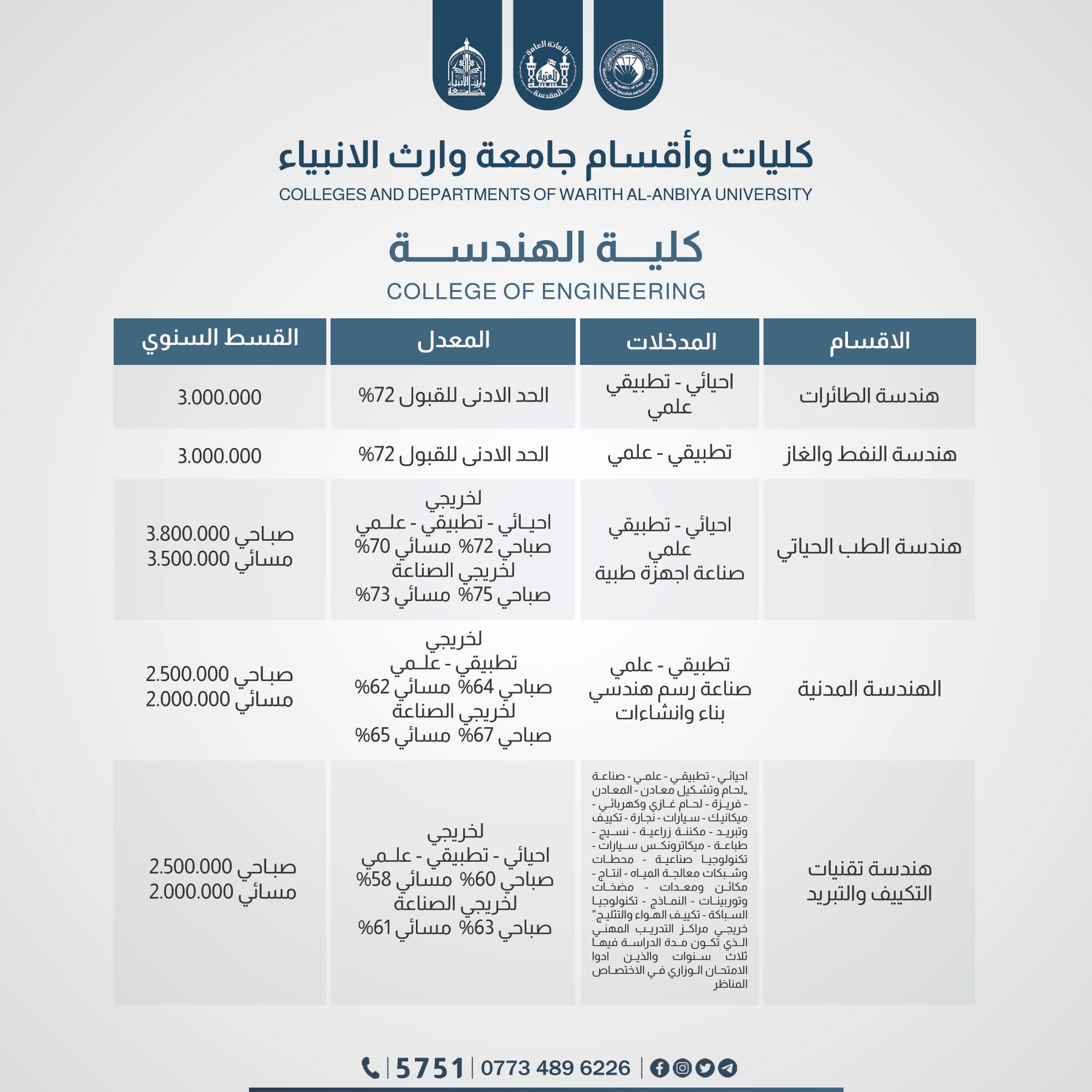 To the dear students interested in applying to the #EngineeringCollege at the University of Warith Al-Anbiyaa (peace be upon him), stay informed about the latest updates in averages and admissions during the #LastWeek of the official registration period.