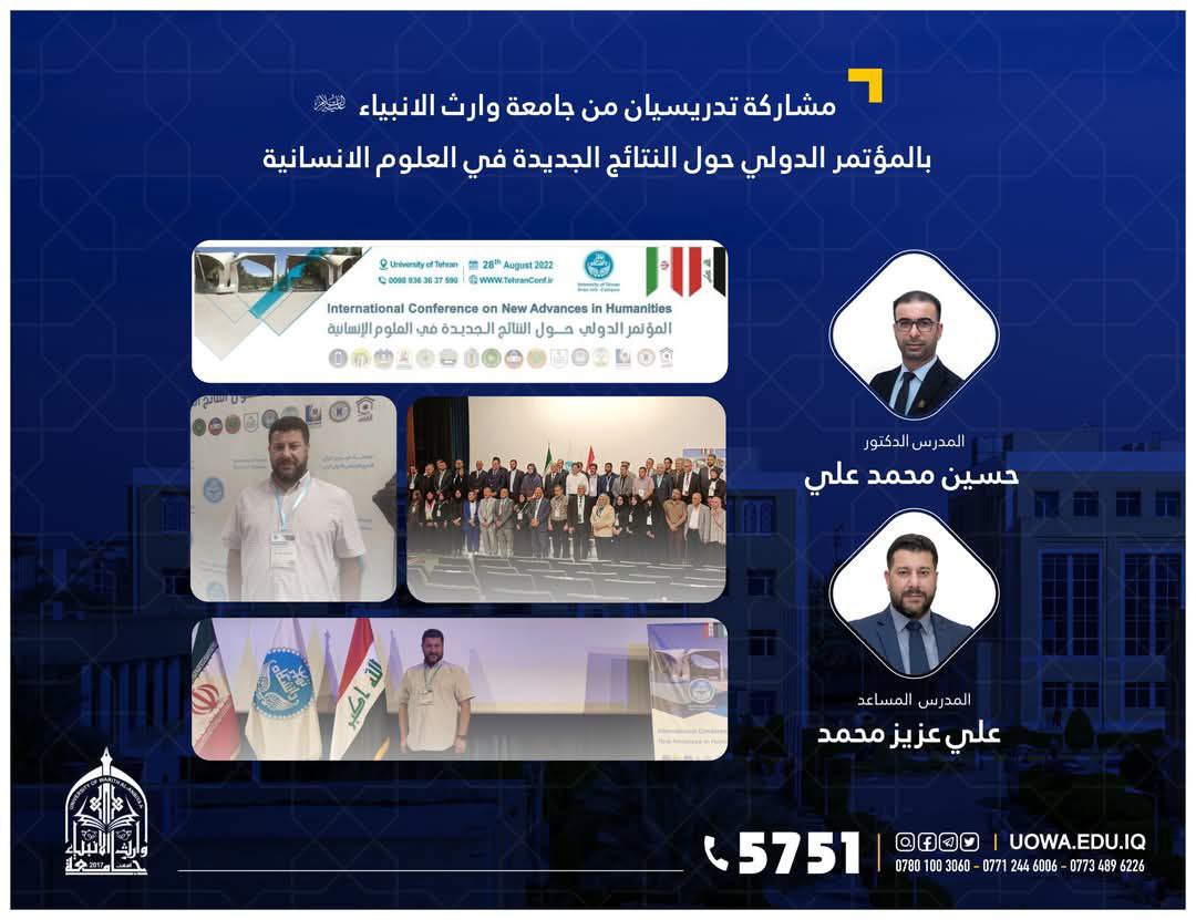 Two faculty members from the College of Business and Economics / Department of Business Administration, Assistant Professor Dr. Hussein Muhammad Ali and Assistant Lecturer Ali Aziz Al-Kalkawi, participated in the "International Conference on New Findings in the Humanities," organized by the University of Tehran. The conference saw wide participation from several Arab and international countries.