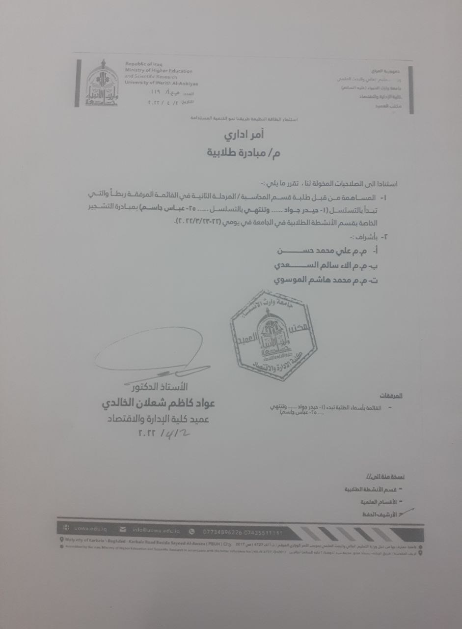 A group of students from the College of Administration and Economics, Department of Business Administration, second stage, participated in the afforestation initiative of the Student Activities Department at the university