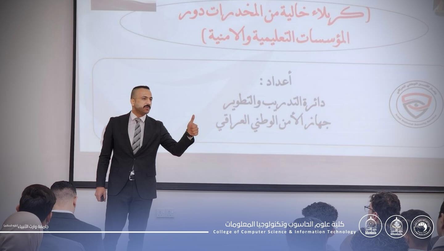 The College of Computer Science and Information Technology at Warith Al-Anbiyaa University (peace be upon him), in cooperation with the Iraqi National Security Service / Training and Development Directorate and the Karbala Security Directorate, launched an awareness workshop entitled “Karbala Free of Drugs – The Role of Security Institutions.” The workshop targeted first-year students in the Departments of Information Technology, Cybersecurity, and Artificial Intelligence.