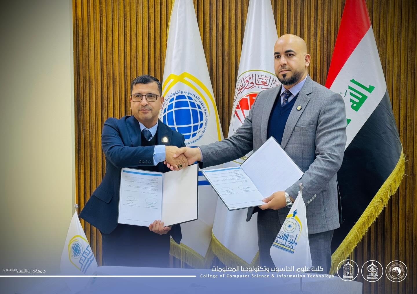 As part of strengthening academic cooperation and the exchange of scientific expertise, Assistant Professor Dr. Haider Mohammed Ali Al-Ghanmi, Dean of the College of Computer Science and Information Technology at the University of Warith Al-Anbiyaa (peace be upon him), signed a scientific twinning agreement with Assistant Professor Dr. Muwaffaq Kazem Al-Hassnawi, Dean of the College of Computer Science and Information Technology at the University of Karbala.