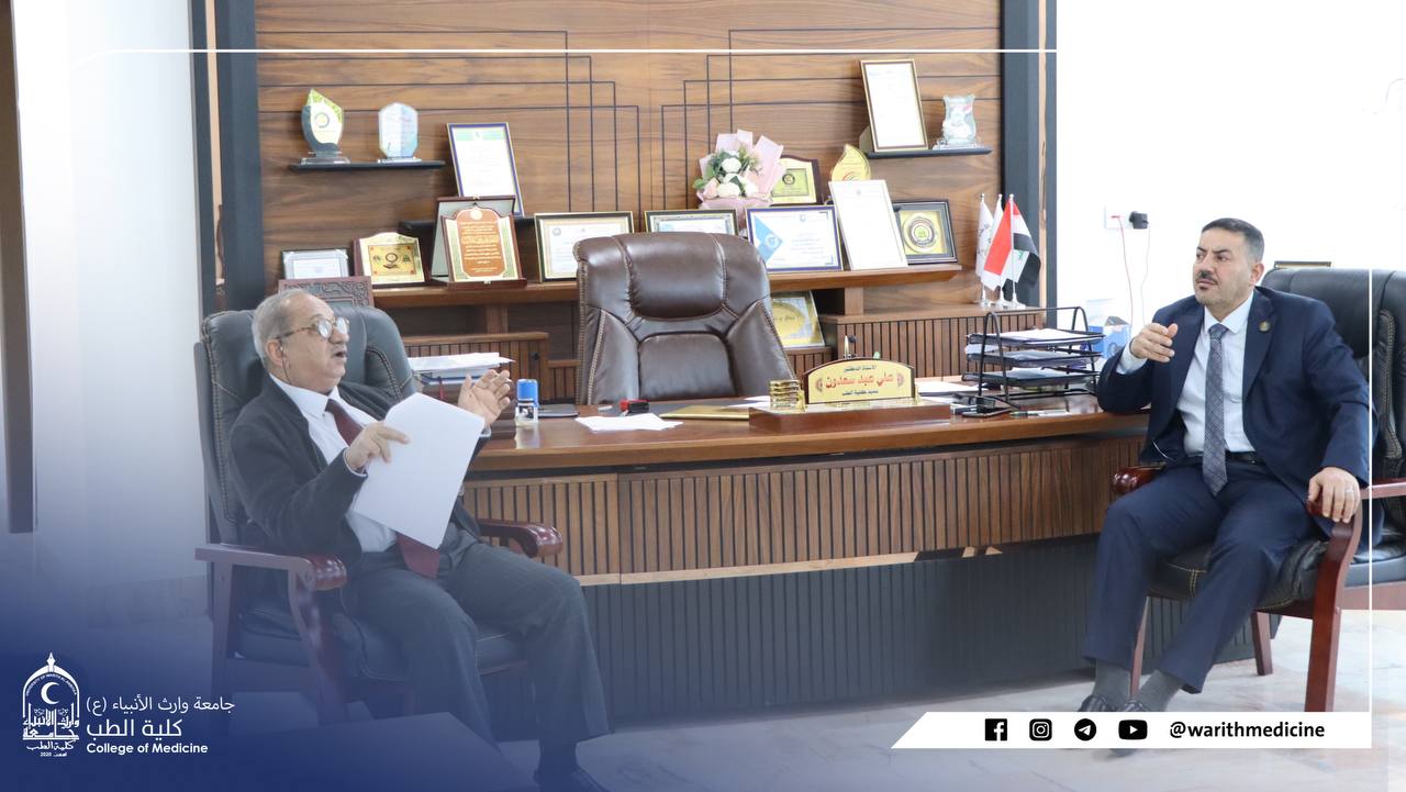 The College of Medicine Council at Warith Al-Anbia University (peace be upon him) held its regular session, headed by Professor Dr. Ali Abdul Saadoun, the respected Dean of the College, and attended by Assistant Professor Dr. Laith Muhammad, the Scientific Assistant, and Lecturer Dr. Anwar Sadiq, the Administrative Assistant, in addition to the respected heads of the branches.