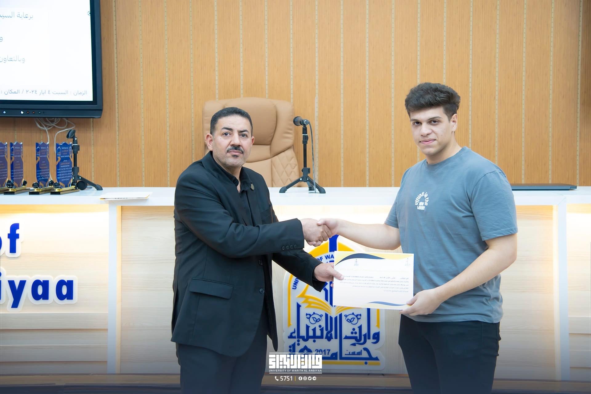 The Deanship of the Faculty of Medicine, Warith Al-Anbiya University, peace be upon him, represented by the respected Dean, Professor Dr. Ali Abd Saadoun, honored both the employee (Hussein Majeed) and the employee (Younis Essam) for their efforts in conducting the end-of-course exams for first-year students, wishing them continued success in serving the students and the university.